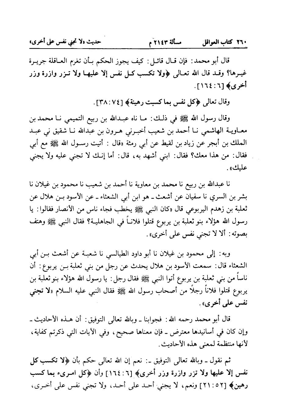 ثُمَّ نَقُولُ - وَبِاَللَّهِ تَعَالَى التَّوْفِيقُ -: نَعَمْ إنَّ اللَّهَ تَعَالَى حَكَمَ بِأَنْ {وَلا تَكْسِبُ كُلُّ نَفْسٍ إِلا عَلَيْهَا وَلا تَزِرُ وَازِرَةٌ وِزْرَ أُخْرَى} [الأنعام: 164] وَأَنَّ {كُلُّ امْرِئٍ بِمَا كَسَبَ رَهِينٌ} [الطور: 21] وَنَعَمْ، لَا يَجْنِي أَحَدٌ عَلَى أَحَدٍ، وَلَا تَجْنِي نَفْسٌ عَلَى أُخْرَى،