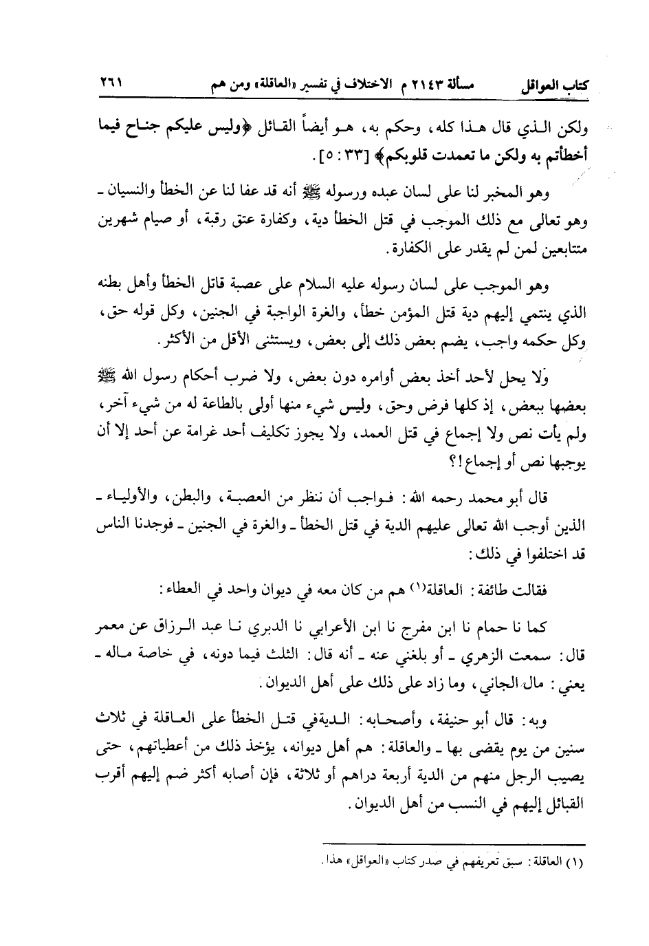 وَلَا يَحِلُّ لِأَحَدٍ أَخْذُ بَعْضِ أَوَامِرِهِ دُونَ بَعْضٍ، وَلَا ضَرْبُ أَحْكَامِ رَسُولِ اللَّهِ - صَلَّى اللَّهُ عَلَيْهِ وَسَلَّمَ - بَعْضِهَا بِبَعْضٍ، إذْ كُلُّهَا فَرْضٌ وَحَقٌّ، وَلَيْسَ شَيْءٌ مِنْهَا أَوْلَى بِالطَّاعَةِ لَهُ مِنْ شَيْءٍ آخَرَ، وَلَمْ يَأْتِ نَصٌّ وَلَا إجْمَاعٌ فِي قَتْلِ الْعَمْدِ، وَلَا يَجُوزُ تَكْلِيفُ أَحَدٍ غَرَامَةً عَنْ أَحَدٍ إلَّا أَنْ يُوجِبَهَا نَصٌّ أَوْ إجْمَاعٌ؟ قَالَ أَبُو مُحَمَّدٍ - رَحِمَهُ اللَّهُ -: فَوَاجِبٌ أَنْ نَنْظُرَ مَنْ الْعَصَبَةُ، وَالْبَطْنُ، وَالْأَوْلِيَاءُ - الَّذِينَ أَوْجَبَ اللَّهُ تَعَالَى عَلَيْهِمْ الدِّيَةَ فِي قَتْلِ الْخَطَأِ - وَالْغُرَّةَ فِي الْجَنِينِ - فَوَجَدْنَا النَّاسَ قَدْ اخْتَلَفُوا فِي ذَلِكَ: فَقَالَتْ طَائِفَةٌ: الْعَاقِلَةُ هُمْ مَنْ كَانَ مَعَهُ فِي دِيوَانٍ وَاحِدٍ فِي الْعَطَاءِ: كَمَا نا حُمَامٌ نا ابْنُ مُفَرِّجٍ نا ابْنُ الْأَعْرَابِيِّ نا الدَّبَرِيُّ نا عَبْدُ الرَّزَّاقِ عَنْ مَعْمَرٍ قَالَ: سَمِعْت الزُّهْرِيَّ - أَوْ بَلَغَنِي عَنْهُ - أَنَّهُ قَالَ: الثُّلُثُ فِيمَا دُونَهُ، فِي خَاصَّةِ مَالِهِ - يَعْنِي: مَالَ الْجَانِي، وَمَا زَادَ عَلَى ذَلِكَ عَلَى أَهْلِ الدِّيوَانِ.