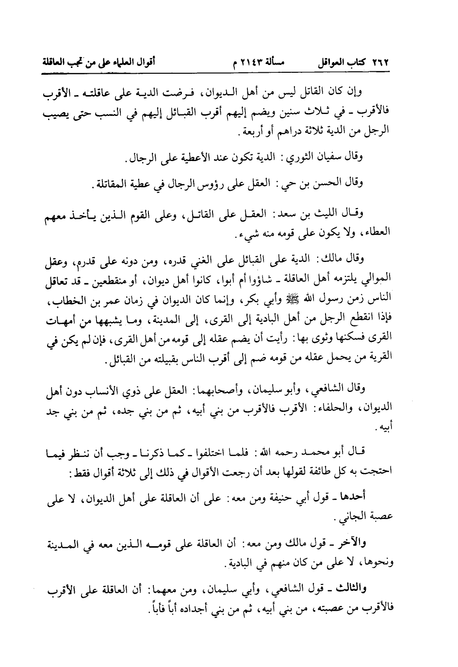 قَالَ أَبُو مُحَمَّدٍ - رَحِمَهُ اللَّهُ -: فَلَمَّا اخْتَلَفُوا - كَمَا ذَكَرْنَا - وَجَبَ أَنْ نَنْظُرَ فِيمَا احْتَجَّتْ بِهِ كُلُّ طَائِفَةٍ لِقَوْلِهَا بَعْدَ أَنْ رَجَعَتْ الْأَقْوَالُ فِي ذَلِكَ إلَى ثَلَاثَةِ أَقْوَالٍ فَقَطْ: أَحَدُهَا - قَوْلُ أَبِي حَنِيفَةَ وَمَنْ مَعَهُ: عَلَى أَنَّ الْعَاقِلَةَ عَلَى أَهْلِ الدِّيوَانِ، لَا عَلَى عَصَبَةِ الْجَانِي.