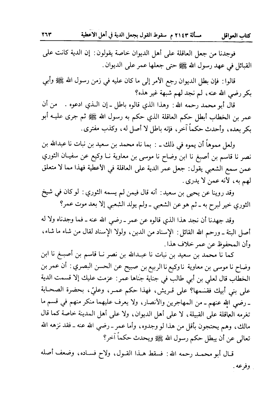 قَالُوا: فَإِنْ بَطَلَ الدِّيوَانُ رَجَعَ الْأَمْرُ إلَى مَا كَانَ عَلَيْهِ فِي زَمَنِ رَسُولِ اللَّهِ - صَلَّى اللَّهُ عَلَيْهِ وَسَلَّمَ - وَأَبِي بَكْرٍ - رَضِيَ اللَّهُ عَنْهُ - لَمْ نَجِدْ لَهُمْ شُبْهَةً غَيْرَ هَذِهِ؟ قَالَ أَبُو مُحَمَّدٍ - رَحِمَهُ اللَّهُ -: وَهَذَا الَّذِي قَالُوهُ بَاطِلٌ - إنَّ الَّذِي ادَّعَوْهُ مِنْ أَنَّ عُمَرَ بْنَ الْخَطَّابِ أَبْطَلَ حُكْمَ الْعَاقِلَةِ الَّذِي حَكَمَ بِهِ رَسُولُ اللَّهِ - صَلَّى اللَّهُ عَلَيْهِ وَسَلَّمَ - ثُمَّ جَرَى عَلَيْهِ أَبُو بَكْرٍ بَعْدَهُ، وَأَحْدَثَ حُكْمًا آخَرَ، فَإِنَّهُ بَاطِلٌ لَا أَصْلَ لَهُ، وَكَذِبٌ مُفْتَرَى.