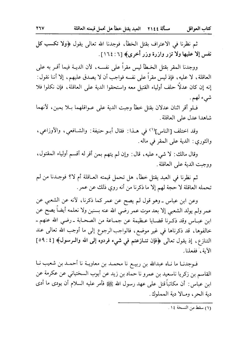 ثُمَّ نَظَرْنَا فِي الْعَبْدِ يُقْتَلُ خَطَأً، هَلْ تَحْمِلُ قِيمَتَهُ الْعَاقِلَةُ أَمْ لَا؟ فَوَجَدْنَا مَنْ لَمْ تَحْمِلْهُ الْعَاقِلَةُ لَا حُجَّةَ لَهُمْ إلَّا مَا ذَكَرْنَا مِنْ أَنَّهُ رُوِيَ ذَلِكَ عَنْ عُمَرَ.
