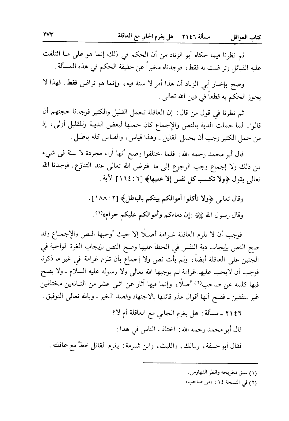 2146 - مَسْأَلَةٌ: هَلْ يَغْرَمُ الْجَانِي مَعَ الْعَاقِلَةِ أَمْ لَا؟ قَالَ أَبُو مُحَمَّدٍ - رَحِمَهُ اللَّهُ -: اخْتَلَفَ النَّاسُ فِي هَذَا: فَقَالَ أَبُو حَنِيفَةَ، وَمَالِكٌ، وَاللَّيْثُ، وَابْنُ شُبْرُمَةَ: يَغْرَمُ الْقَاتِلُ خَطَأً مَعَ عَاقِلَتِهِ.