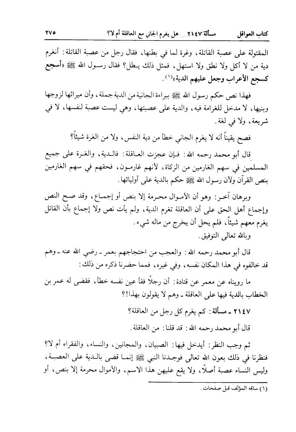 الْمَقْتُولَةِ عَلَى عَصَبَةِ الْقَاتِلَةِ، وَغُرَّةً لِمَا فِي بَطْنِهَا، فَقَالَ رَجُلٌ مِنْ عَصَبَةِ الْقَاتِلَةِ: أَنَغْرَمُ دِيَةَ مَنْ لَا أَكَلَ وَلَا نَطَقَ وَلَا اسْتَهَلَّ، فَمِثْلُ ذَلِكَ يُطَلُّ؟ فَقَالَ رَسُولُ اللَّهِ - صَلَّى اللَّهُ عَلَيْهِ وَسَلَّمَ - أَسَجْعٌ كَسَجْعِ الْأَعْرَابِ وَجَعَلَ عَلَيْهِمْ الدِّيَةَ» فَهَذَا نَصُّ حُكْمِ رَسُولِ اللَّهِ - صَلَّى اللَّهُ عَلَيْهِ وَسَلَّمَ - بِبَرَاءَةِ الْجَانِيَةِ مِنْ الدِّيَةِ جُمْلَةً، وَأَنَّ مِيرَاثَهَا لِزَوْجِهَا وَبَنِيهَا، لَا مَدْخَلَ لِلْغَرَامَةِ فِيهِ، وَالدِّيَةُ عَلَى عَصَبَتِهَا، وَهِيَ لَيْسَتْ عَصَبَةً لِنَفْسِهَا، لَا فِي شَرِيعَةٍ، وَلَا فِي لُغَةٍ.