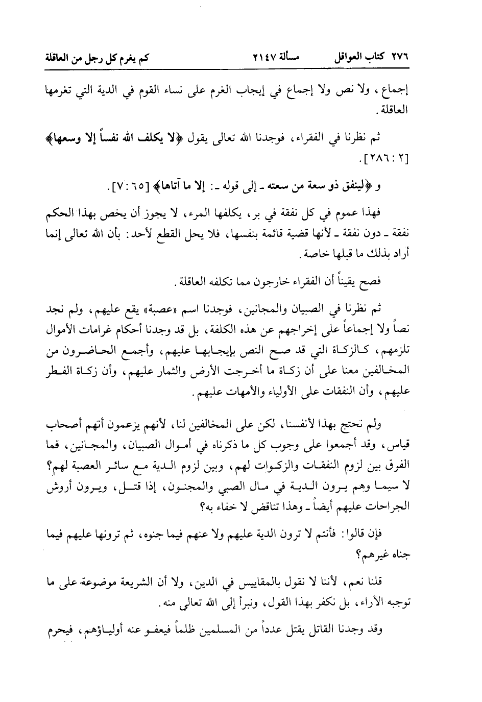 ثُمَّ نَظَرْنَا فِي الصِّبْيَانِ وَالْمَجَانِينِ، فَوَجَدْنَا اسْمَ " عَصَبَةٍ " يَقَعُ عَلَيْهِمْ، وَلَمْ نَجِدْ نَصًّا وَلَا إجْمَاعًا عَلَى إخْرَاجِهِمْ عَنْ هَذِهِ الْكُلْفَةِ، بَلْ قَدْ وَجَدْنَا أَحْكَامَ غَرَامَاتِ الْأَمْوَالِ تَلْزَمُهُمْ، كَالزَّكَاةِ الَّتِي قَدْ صَحَّ النَّصُّ بِإِيجَابِهَا عَلَيْهِمْ، وَأَجْمَعَ الْحَاضِرُونَ مِنْ الْمُخَالِفِينَ مَعَنَا عَلَى أَنَّ زَكَاةَ مَا أَخْرَجَتْ الْأَرْضُ، وَالثِّمَارِ عَلَيْهِمْ، وَأَنَّ زَكَاةَ الْفِطْرِ عَلَيْهِمْ، وَأَنَّ النَّفَقَاتِ عَلَى الْأَوْلِيَاءِ وَالْأُمَّهَاتِ عَلَيْهِمْ.