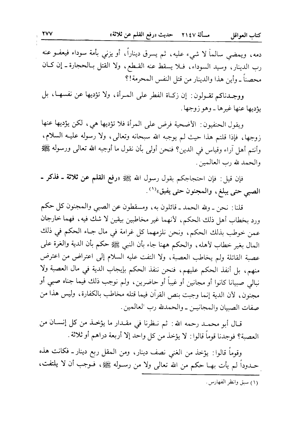 دَمُهُ، وَيَمْضِي سَالِمًا لَا شَيْءَ عَلَيْهِ، ثُمَّ يَسْرِقُ دِينَارًا، أَوْ يَزْنِي بِأَمَةٍ سَوْدَاءَ فَيَعْفُو عَنْهُ رَبُّ الدِّينَارِ، وَسَيِّدُ السَّوْدَاءِ، فَلَا يَسْقُطُ عَنْهُ الْقَطْعُ، وَلَا الْقَتْلُ بِالْحِجَارَةِ - إنْ كَانَ مُحْصَنًا - وَأَيْنَ هَذَا وَالدِّينَارُ مِنْ قَتْلِ النَّفْسِ الْمُحَرَّمَةِ؟ وَوَجَدْنَاكُمْ تَقُولُونَ: إنَّ زَكَاةَ الْفِطْرِ عَلَى الْمَرْأَةِ، وَلَا تُؤَدِّيهَا عَنْ نَفْسِهَا، بَلْ يُؤَدِّيهَا عَنْهَا غَيْرُهَا - وَهُوَ زَوْجُهَا.