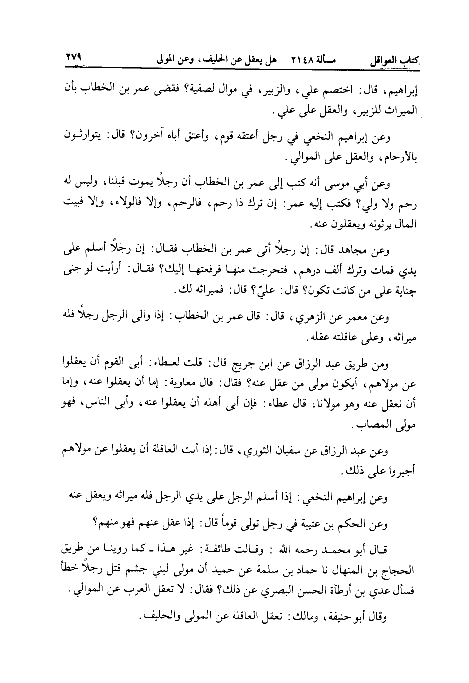 إبْرَاهِيمَ، قَالَ: اخْتَصَمَ عَلِيٌّ، وَالزُّبَيْرُ، فِي مَوَالٍ لِصَفِيَّةَ؟ فَقَضَى عُمَرُ بْنُ الْخَطَّابِ بِأَنَّ الْمِيرَاثَ لِلزُّبَيْرِ، وَالْعَقْلَ عَلَى عَلِيٍّ.