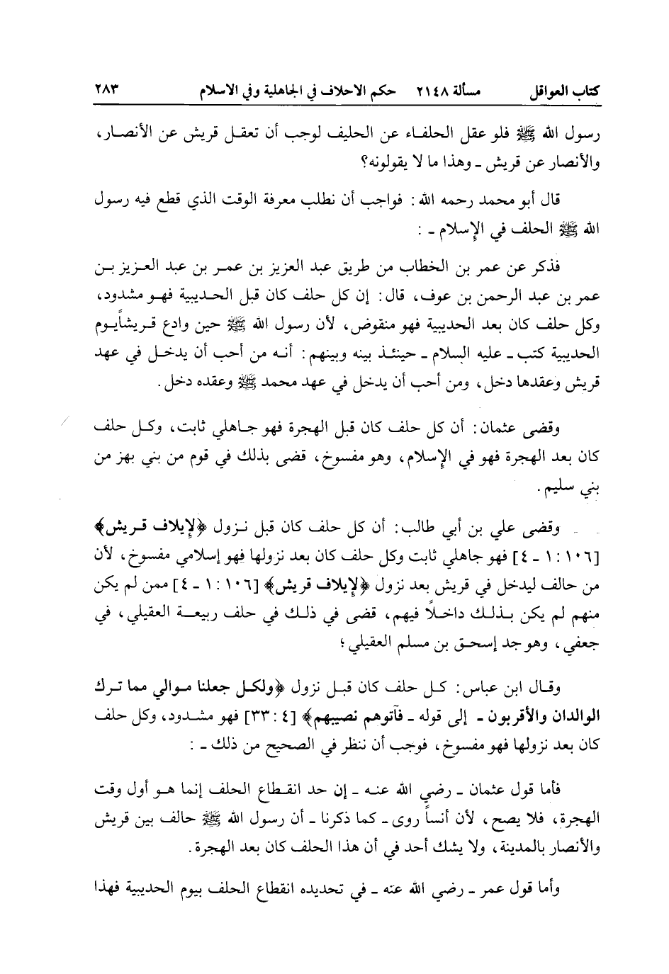 رَسُولُ اللَّهِ - صَلَّى اللَّهُ عَلَيْهِ وَسَلَّمَ - فَلَوْ عَقَلَ الْحُلَفَاءُ عَنْ الْحَلِيفِ لَوَجَبَ أَنْ تَعْقِلَ قُرَيْشٌ عَنْ الْأَنْصَارِ، وَالْأَنْصَارُ عَنْ قُرَيْشٍ - وَهَذَا مَا لَا يَقُولُونَهُ؟ قَالَ أَبُو مُحَمَّدٍ - رَحِمَهُ اللَّهُ -: فَوَاجِبٌ أَنْ نَطْلُبَ مَعْرِفَةَ الْوَقْتِ الَّذِي قَطَعَ فِيهِ رَسُولُ اللَّهِ - صَلَّى اللَّهُ عَلَيْهِ وَسَلَّمَ - الْحِلْفَ فِي الْإِسْلَامِ -: فَذُكِرَ عَنْ عُمَرَ بْنِ الْخَطَّابِ مِنْ طَرِيقِ عَبْدِ الْعَزِيزِ بْنِ عُمَرَ بْنِ عَبْدِ الْعَزِيزِ بْنِ عُمَرَ بْنِ عَبْدِ الرَّحْمَنِ بْنِ عَوْفٍ، قَالَ: إنَّ كُلَّ حِلْفٍ كَانَ قَبْلَ الْحُدَيْبِيَةِ فَهُوَ مَشْدُودٌ، وَكُلَّ حِلْفٍ كَانَ بَعْدَ الْحُدَيْبِيَةِ فَهُوَ مَنْقُوضٌ؛ لِأَنَّ «رَسُولَ اللَّهِ - صَلَّى اللَّهُ عَلَيْهِ وَسَلَّمَ - حِينَ وَادَعَ قُرَيْشًا يَوْمَ الْحُدَيْبِيَةِ كَتَبَ - عَلَيْهِ السَّلَامُ - حِينَئِذٍ بَيْنَهُ وَبَيْنَهُمْ: أَنَّهُ مَنْ أَحَبَّ أَنْ يَدْخُلَ فِي عَهْدِ قُرَيْشٍ وَعَقْدِهَا دَخَلَ، وَمَنْ أَحَبَّ أَنْ يَدْخُلَ فِي عَهْدِ مُحَمَّدٍ - صَلَّى اللَّهُ عَلَيْهِ وَسَلَّمَ - وَعَقْدِهِ دَخَلَ» .