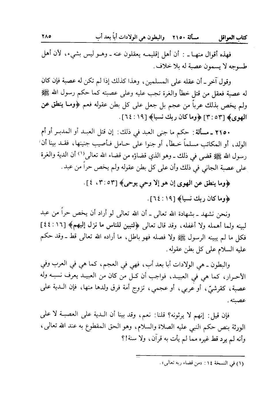 وَالْبُطُونُ - هِيَ الْوِلَادَاتُ أَبًا بَعْدَ أَبٍ، فَهِيَ فِي الْعَجَمِ، كَمَا هِيَ فِي الْعَرَبِ وَفِي الْأَحْرَارِ، كَمَا هِيَ فِي الْعَبِيدِ، فَوَاجِبٌ أَنَّ كُلَّ مَنْ كَانَ مِنْ الْعَبِيدِ يُعْرَفُ نَسَبُهُ وَلَهُ عَصَبَةٌ، كَقُرَشِيٍّ، أَوْ عَرَبِيٍّ، أَوْ عَجَمِيٍّ، تَزَوَّجَ أَمَةً فَرَقَّ وَلَدُهَا مِنْهَا، فَإِنَّ الدِّيَةَ عَلَى عَصَبَتِهِ.