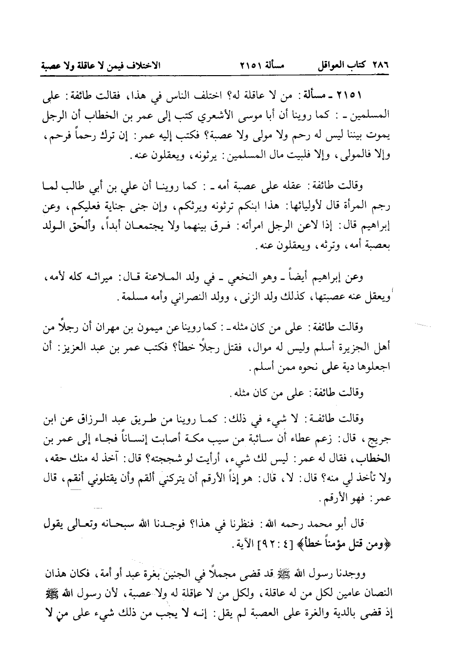 وَقَالَتْ طَائِفَةٌ: عَقْلُهُ عَلَى عَصَبَةِ أُمِّهِ -: كَمَا رُوِّينَا أَنَّ عَلِيَّ بْنَ أَبِي طَالِبٍ لَمَّا رَجَمَ الْمَرْأَةَ قَالَ لِأَوْلِيَائِهَا: هَذَا ابْنُكُمْ تَرِثُونَهُ وَيَرِثُكُمْ، وَإِنْ جَنَى جِنَايَةً فَعَلَيْكُمْ.