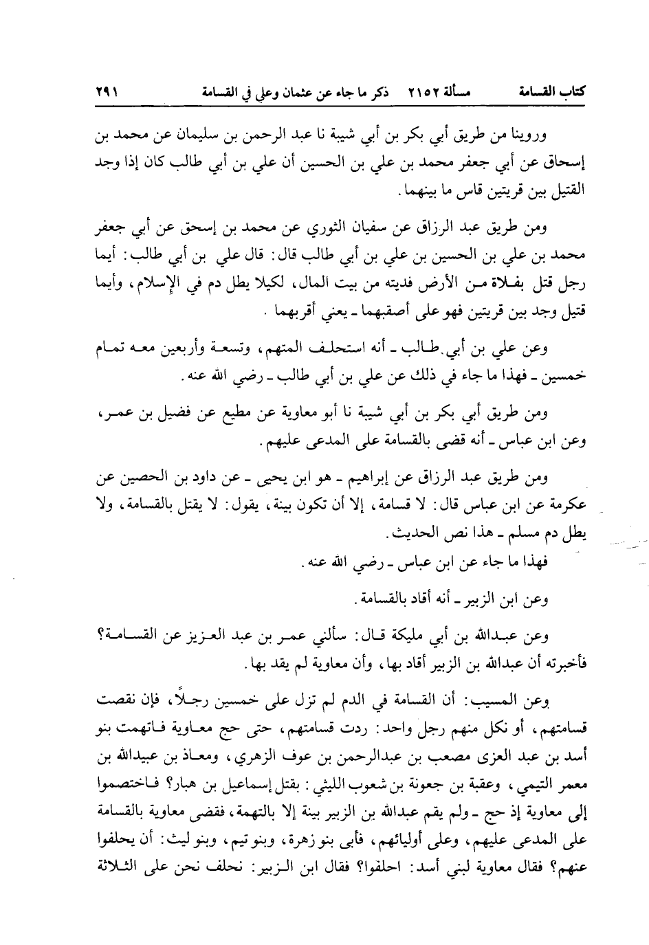 وَعَنْ ابْنِ الزُّبَيْرِ - أَنَّهُ أَقَادَ بِالْقَسَامَةِ، وَعَنْ عَبْدِ اللَّهِ بْنِ أَبِي مُلَيْكَةَ قَالَ: سَأَلَنِي عُمَرُ بْنُ عَبْدِ الْعَزِيزِ عَنْ الْقَسَامَةِ؟ فَأَخْبَرْته أَنَّ عَبْدَ اللَّهِ بْنَ الزُّبَيْرِ أَقَادَ بِهَا، وَأَنَّ مُعَاوِيَةَ لَمْ يَقُدْ بِهَا.
