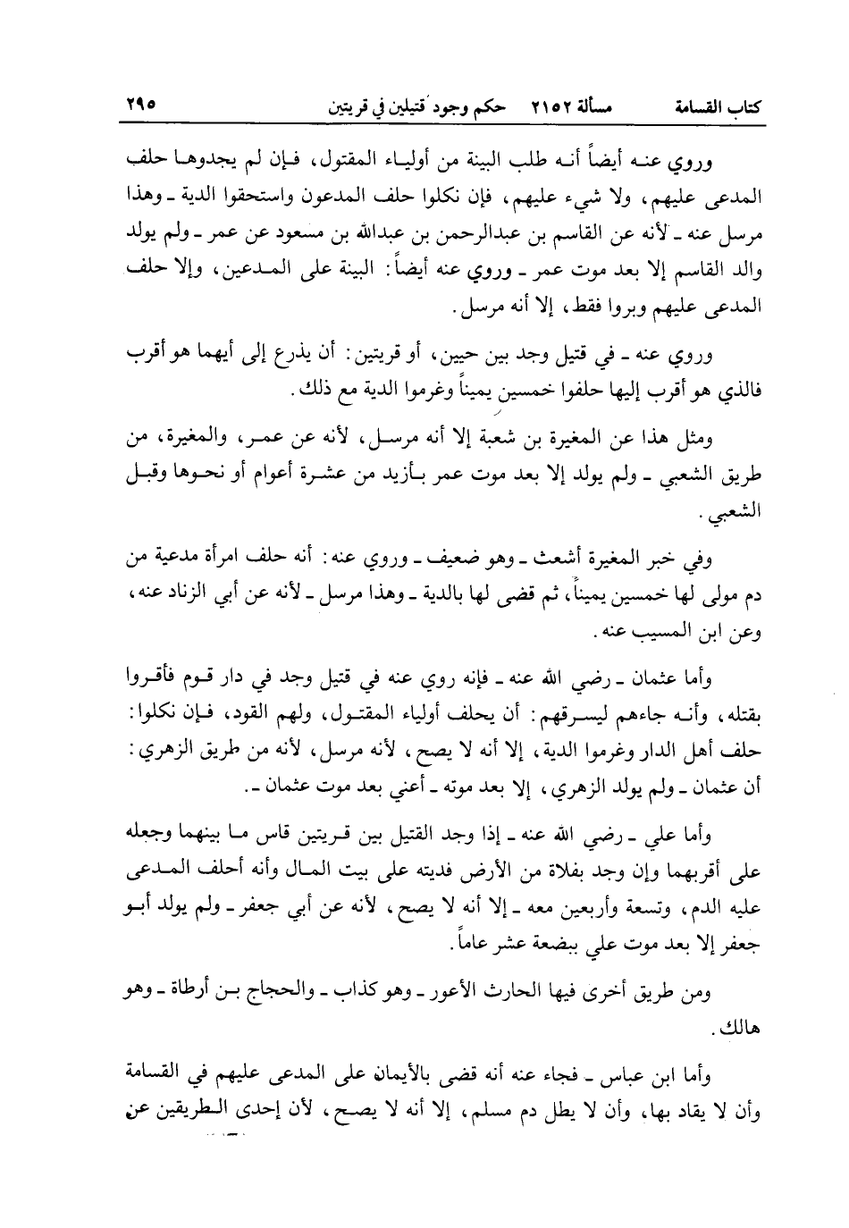 وَأَمَّا عَلِيٌّ - رَضِيَ اللَّهُ عَنْهُ -: إذَا وُجِدَ الْقَتِيلُ بَيْنَ قَرْيَتَيْنِ قَاسَ مَا بَيْنَهُمَا وَجَعَلَهُ عَلَى أَقْرَبِهِمَا وَإِنْ وُجِدَ بِفَلَاةٍ مِنْ الْأَرْضِ فَدِيَتُهُ عَلَى بَيْتِ الْمَالِ وَأَنَّهُ أَحْلَفَ الْمُدَّعَى عَلَيْهِ الدَّمَ، وَتِسْعَةً وَأَرْبَعِينَ مَعَهُ - إلَّا أَنَّهُ لَا يَصِحُّ؛ لِأَنَّهُ عَنْ أَبِي جَعْفَرٍ - وَلَمْ يُولَدْ أَبُو جَعْفَرٍ إلَّا بَعْدَ مَوْتِ عَلِيٍّ بِبِضْعَةِ عَشَرَ عَامًا.