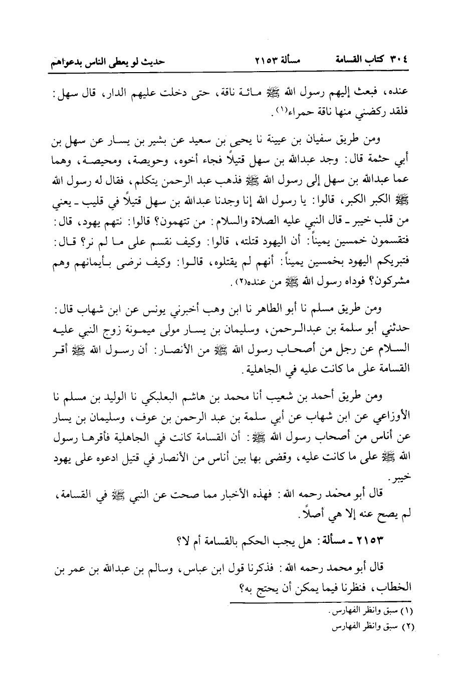 2153 - مَسْأَلَةٌ: هَلْ يَجِبُ الْحُكْمُ بِالْقَسَامَةِ أَمْ لَا؟ قَالَ أَبُو مُحَمَّدٍ - رَحِمَهُ اللَّهُ -: فَذَكَرْنَا قَوْلَ ابْنِ عَبَّاسٍ، وَسَالِمِ بْنِ عَبْدِ اللَّهِ بْنِ عُمَرَ بْنِ الْخَطَّابِ، فَنَظَرْنَا فِيمَا يُمْكِنُ أَنْ يُحْتَجَّ بِهِ؟