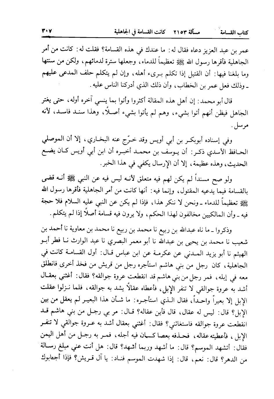 عُمَرَ بْنَ عَبْدِ الْعَزِيزِ دَعَاهُ فَقَالَ لَهُ: مَا عِنْدَك فِي هَذِهِ الْقَسَامَةِ؟ فَقُلْت لَهُ: كَانَتْ مِنْ أَمْرِ الْجَاهِلِيَّةِ فَأَقَرَّهَا رَسُولُ اللَّهِ - صَلَّى اللَّهُ عَلَيْهِ وَسَلَّمَ - تَعْظِيمًا لِلدِّمَاءِ، وَجَعَلَهَا سُتْرَةً لِدِمَائِهِمْ، وَلَكِنْ مِنْ سُنَّتِهَا وَمَا بَلَغَنَا فِيهَا: أَنَّ الْقَتِيلَ إذَا تَكَلَّمَ بَرِئَ أَهْلُهُ، وَإِنْ لَمْ يَتَكَلَّمْ حَلَفَ الْمُدَّعَى عَلَيْهِمْ - وَذَلِكَ فِعْلُ عُمَرَ بْنِ الْخَطَّابِ، وَأَنَّ ذَلِكَ الَّذِي أَدْرَكْنَا النَّاسَ عَلَيْهِ.