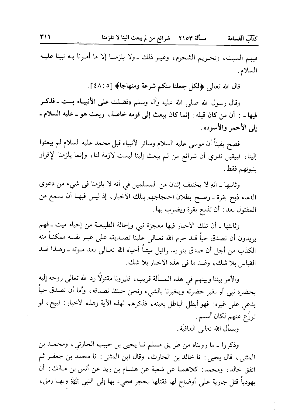 وَثَانِيهَا - أَنَّهُ لَا يَخْتَلِفُ اثْنَانِ مِنْ الْمُسْلِمِينَ فِي أَنَّهُ لَا يَلْزَمُنَا فِي شَيْءٍ مِنْ دَعْوَى الدِّمَاءِ ذَبْحُ بَقَرَةٍ - وَصَحَّ بُطْلَانُ احْتِجَاجِهِمْ بِتِلْكَ الْأَخْبَارِ، إذْ لَيْسَ فِيهَا أَنْ يُسْمَعَ مِنْ الْمَقْتُولِ بَعْدَ: أَنْ تُذْبَحَ بَقَرَةٌ وَيُضْرَبَ بِهَا.
