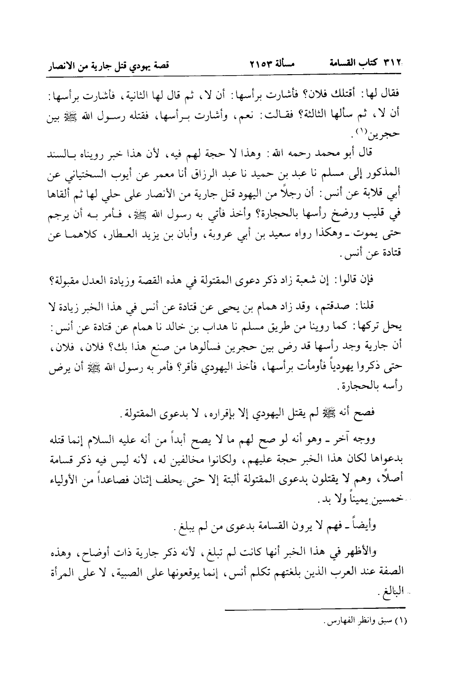 فَقَالَ لَهَا: أَقَتَلَكَ فُلَانٌ؟ فَأَشَارَتْ بِرَأْسِهَا: أَنْ لَا، ثُمَّ قَالَ لَهَا الثَّانِيَةَ، فَأَشَارَتْ بِرَأْسِهَا: أَنْ لَا، سَأَلَهَا الثَّالِثَةَ؟ فَقَالَتْ: نَعَمْ، وَأَشَارَتْ بِرَأْسِهَا، فَقَتَلَهُ رَسُولُ اللَّهِ - صَلَّى اللَّهُ عَلَيْهِ وَسَلَّمَ - بَيْنَ حَجَرَيْنِ» قَالَ أَبُو مُحَمَّدٍ - رَحِمَهُ اللَّهُ -: وَهَذَا لَا حُجَّةَ لَهُمْ فِيهِ؛ لِأَنَّ هَذَا خَبَرٌ رُوِّينَاهُ بِالسَّنَدِ الْمَذْكُورِ إلَى مُسْلِمٍ نا عَبْدُ بْنُ حُمَيْدٍ نا عَبْدُ الرَّزَّاقِ أَنَا مَعْمَرٌ عَنْ أَيُّوبَ السِّخْتِيَانِيِّ عَنْ أَبِي قِلَابَةَ عَنْ أَنَسٍ: «أَنَّ رَجُلًا مِنْ الْيَهُودِ قَتَلَ جَارِيَةً مِنْ الْأَنْصَارِ عَلَى حُلِيٍّ لَهَا ثُمَّ أَلْقَاهَا فِي قَلِيبٍ وَرَضَخَ رَأْسَهَا بِالْحِجَارَةِ؟ وَأُخِذَ فَأُتِيَ بِهِ رَسُولَ اللَّهِ - صَلَّى اللَّهُ عَلَيْهِ وَسَلَّمَ - فَأَمَرَ بِهِ أَنْ يُرْجَمَ حَتَّى يَمُوتَ» وَهَكَذَا رَوَاهُ سَعِيدُ بْنُ أَبِي عَرُوبَةَ، وَأَبَانُ بْنُ يَزِيدَ الْعَطَّارُ، كِلَاهُمَا عَنْ قَتَادَةَ عَنْ أَنَسٍ.