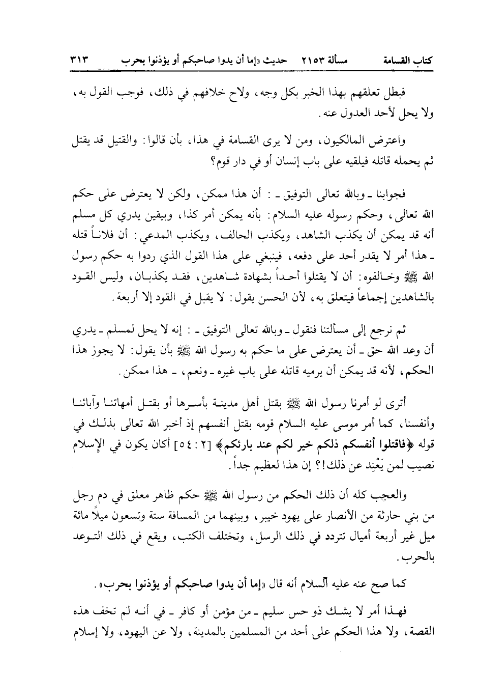 ثُمَّ نَرْجِعُ إلَى مَسْأَلَتِنَا فَنَقُولُ - وَبِاَللَّهِ تَعَالَى التَّوْفِيقُ -: إنَّهُ لَا يَحِلُّ لِمُسْلِمٍ - يَدْرِي أَنَّ وَعْدَ اللَّهِ حَقٌّ - أَنْ يَعْتَرِضَ عَلَى مَا حَكَمَ بِهِ رَسُولُ اللَّهِ - صَلَّى اللَّهُ عَلَيْهِ وَسَلَّمَ - بِأَنْ يَقُولَ: لَا يَجُوزُ هَذَا الْحُكْمُ؛ لِأَنَّهُ قَدْ يُمْكِنُ أَنْ يَرْمِيَهُ قَاتِلُهُ عَلَى بَابِ غَيْرِهِ - وَنَعَمْ، - هَذَا مُمْكِنٌ.
