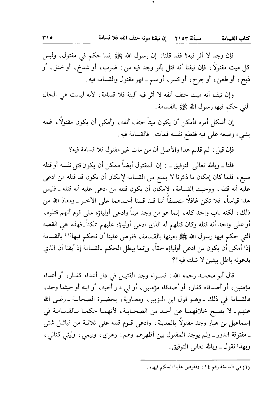 وَإِنْ تَيَقَّنَّا أَنَّهُ مَيِّتٌ حَتْفَ أَنْفِهِ لَا أَثَرَ فِيهِ أَلْبَتَّةَ فَلَا قَسَامَةَ؛ لِأَنَّهُ لَيْسَتْ هِيَ الْحَالَ الَّتِي حَكَمَ فِيهَا رَسُولُ اللَّهِ - صَلَّى اللَّهُ عَلَيْهِ وَسَلَّمَ - بِالْقَسَامَةِ.