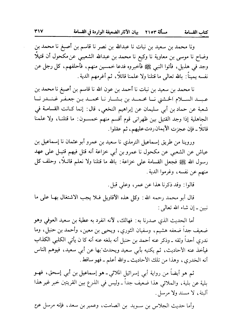 نا مُحَمَّدُ بْنُ سَعِيدِ بْنِ نُبَاتٍ نا أَحْمَدُ بْنُ عَوْنِ اللَّهِ نا قَاسِمُ بْنُ أَصْبَغَ نا مُحَمَّدُ بْنُ عَبْدِ السَّلَامِ الْخُشَنِيُّ نا مُحَمَّدُ بْنُ بَشَّارٍ نا مُحَمَّدُ بْنُ جَعْفَرَ غُنْدَرٌ نا شُعْبَةُ عَنْ حَمَّادِ بْنِ أَبِي سُلَيْمَانَ عَنْ إبْرَاهِيمَ النَّخَعِيِّ، قَالَ: إنَّمَا كَانَتْ الْقَسَامَةُ فِي الْجَاهِلِيَّةِ إذَا وُجِدَ الْقَتِيلُ بَيْنَ ظَهْرَانَيْ قَوْمٍ أَقْسَمَ مِنْهُمْ خَمْسُونَ: مَا قَتَلْنَا، وَلَا عَلِمْنَا قَاتِلًا - فَإِنْ عَجَزَتْ الْأَيْمَانُ رُدَّتْ عَلَيْهِمْ، ثُمَّ عَقَلُوا.