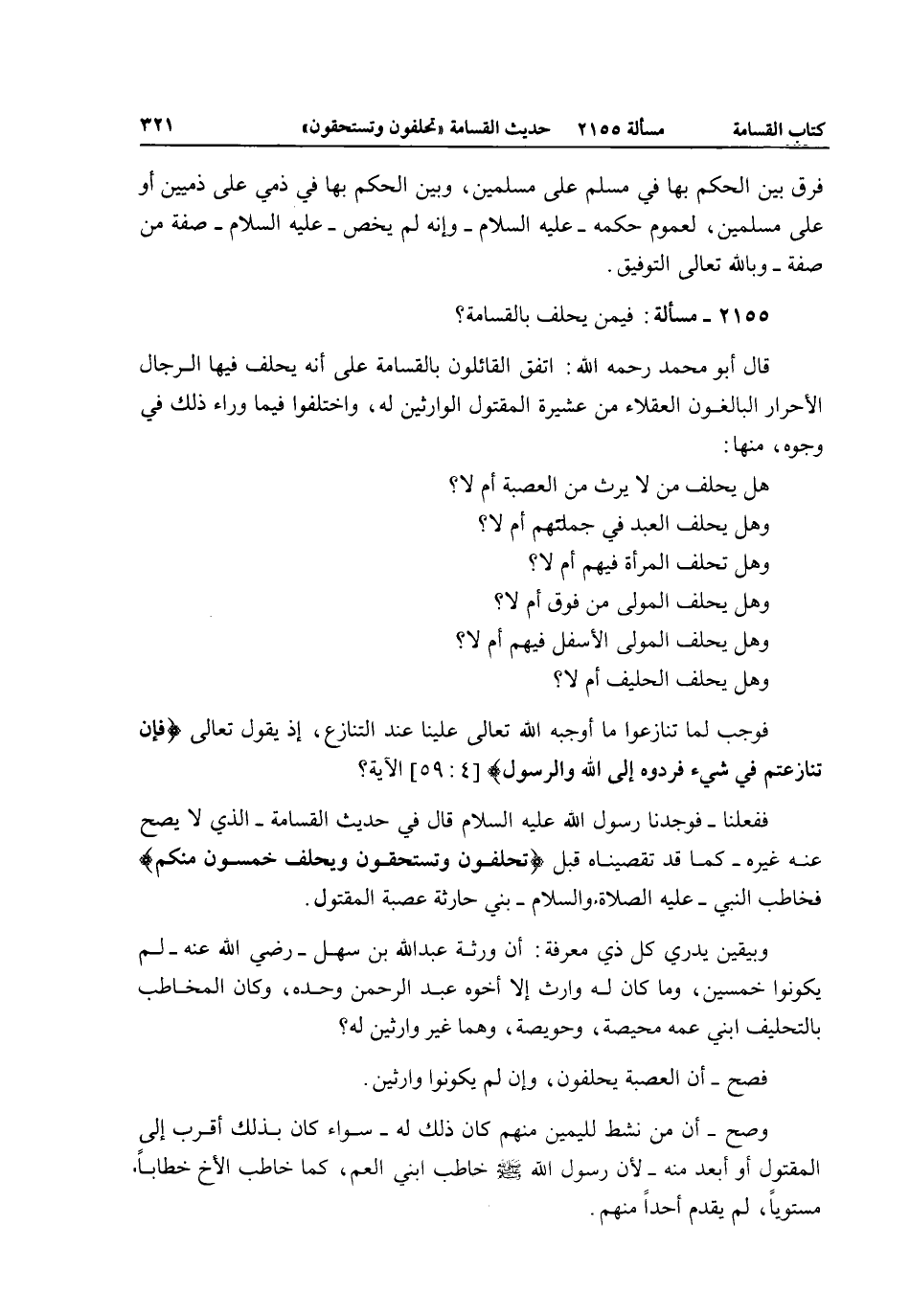 2155 - مَسْأَلَةٌ: فِيمَنْ يَحْلِفُ بِالْقَسَامَةِ؟ قَالَ أَبُو مُحَمَّدٍ - رَحِمَهُ اللَّهُ -: اتَّفَقَ الْقَائِلُونَ بِالْقَسَامَةِ عَلَى أَنَّهُ يَحْلِفُ فِيهَا الرِّجَالُ الْأَحْرَارُ الْبَالِغُونَ الْعُقَلَاءُ مِنْ عَشِيرَةِ الْمَقْتُولِ الْوَارِثِينَ لَهُ، وَاخْتَلَفُوا فِيمَا وَرَاءَ ذَلِكَ فِي وُجُوهٍ، مِنْهَا: هَلْ يَحْلِفُ مَنْ لَا يَرِثُ مِنْ الْعَصَبَةِ أَمْ لَا؟ وَهَلْ يَحْلِفُ الْعَبْدُ فِي جُمْلَتِهِمْ أَمْ لَا؟ وَهَلْ تَحْلِفُ الْمَرْأَةُ فِيهِمْ أَمْ لَا؟ وَهَلْ يَحْلِفُ الْمَوْلَى مِنْ فَوْقُ أَمْ لَا؟ وَهَلْ يَحْلِفُ الْمَوْلَى الْأَسْفَلُ فِيهِمْ أَمْ لَا؟ وَهَلْ يَحْلِفُ الْحَلِيفُ أَمْ لَا؟ فَوَجَبَ لَمَّا تَنَازَعُوا مَا أَوْجَبَهُ اللَّهُ تَعَالَى عَلَيْنَا عِنْدَ التَّنَازُعِ، إذْ يَقُولُ تَعَالَى {فَإِنْ تَنَازَعْتُمْ فِي شَيْءٍ فَرُدُّوهُ إِلَى اللَّهِ وَالرَّسُولِ} [النساء: 59] الْآيَةَ؟ فَفَعَلْنَا - فَوَجَدْنَا رَسُولَ اللَّهِ - عَلَيْهِ السَّلَامُ - قَالَ فِي حَدِيثِ الْقَسَامَةِ - الَّذِي لَا يَصِحُّ عَنْهُ غَيْرُهُ - كَمَا قَدْ تَقَصَّيْنَاهُ قَبْلُ «تَحْلِفُونَ وَتَسْتَحِقُّونَ وَيَحْلِفُ خَمْسُونَ مِنْكُمْ» فَخَاطَبَ النَّبِيُّ - عَلَيْهِ الصَّلَاةُ وَالسَّلَامُ - بَنِي حَارِثَةَ عَصَبَةَ الْمَقْتُولِ.