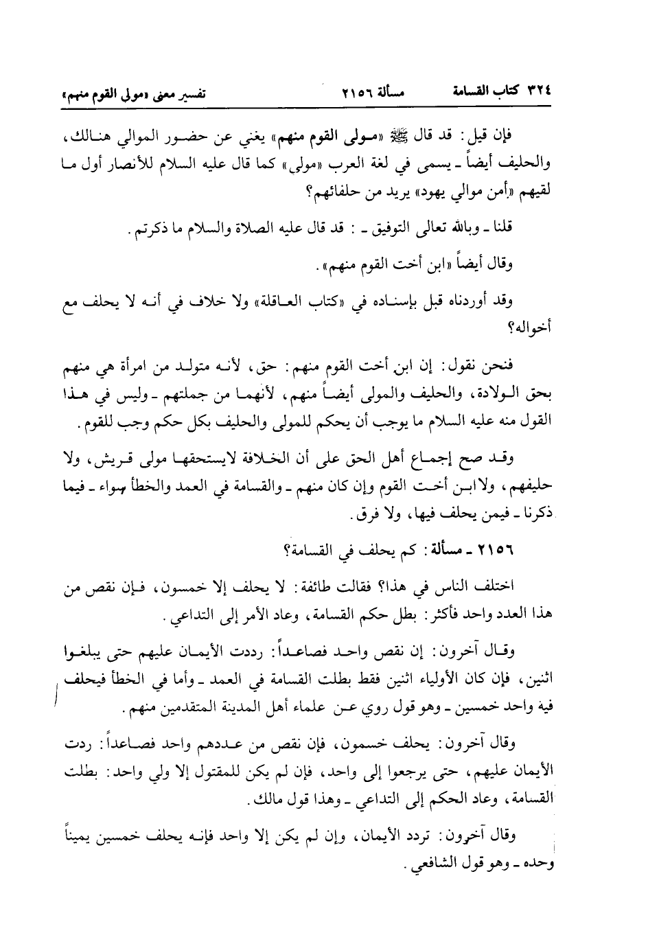 2156 - مَسْأَلَةٌ: كَمْ يَحْلِفُ فِي الْقَسَامَةِ؟ اخْتَلَفَ النَّاسُ فِي هَذَا؟ فَقَالَتْ طَائِفَةٌ: لَا يَحْلِفُ إلَّا خَمْسُونَ، فَإِنْ نَقَصَ مِنْ هَذَا الْعَدَدِ وَاحِدٌ فَأَكْثَرُ: بَطَلَ حُكْمُ الْقَسَامَةِ، وَعَادَ الْأَمْرُ إلَى التَّدَاعِي.