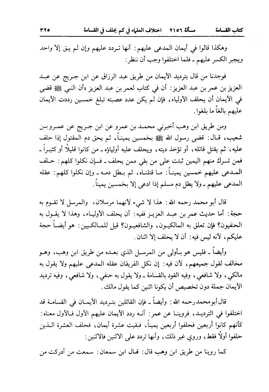 قَالَ أَبُو مُحَمَّدٍ - رَحِمَهُ اللَّهُ -: وَأَيْضًا - فَإِنَّ الْقَائِلِينَ بِتَرْدِيدِ الْأَيْمَانِ فِي الْقَسَامَةِ قَدْ اخْتَلَفُوا فِي التَّرْدِيدِ، فَرُوِّينَا عَنْ عُمَرَ: أَنَّهُ رَدَّدَ الْأَيْمَانَ عَلَيْهِمَا الْأَوَّلَ فَالْأَوَّلَ مَعْنَاهُ: كَأَنَّهُمْ كَانُوا أَرْبَعِينَ فَحَلَفُوا أَرْبَعِينَ يَمِينًا، فَبَقِيَتْ عَشَرَةُ أَيْمَانٍ، فَحَلَفَ الْعَشَرَةُ الَّذِينَ حَلَفُوا أَوَّلًا فَقَطْ، وَرُوِيَ غَيْرُ ذَلِكَ وَأَنَّهَا تُرَدَّدُ عَلَى الِاثْنَيْنِ فَالِاثْنَيْنِ: كَمَا رُوِّينَا مِنْ طَرِيقِ ابْنِ وَهْبٍ قَالَ: قَالَ ابْنُ سَمْعَانَ: سَمِعْت مَنْ أَدْرَكْت مِنْ