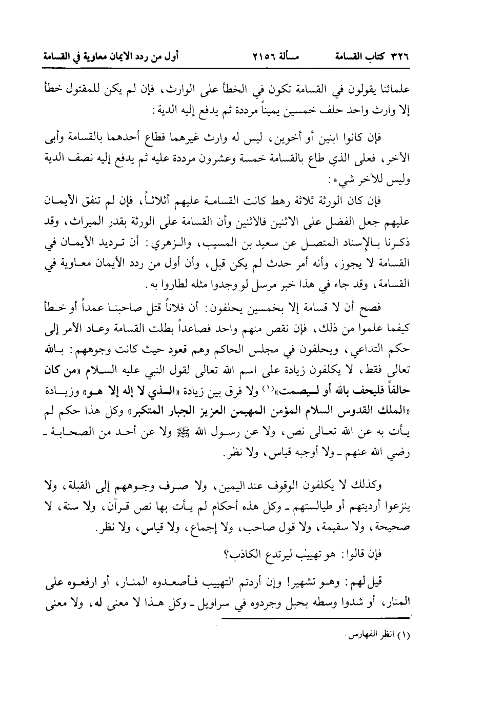 عُلَمَائِنَا يَقُولُونَ فِي الْقَسَامَةِ تَكُونُ فِي الْخَطَأِ عَلَى الْوَارِثِ، فَإِنْ لَمْ يَكُنْ لِلْمَقْتُولِ خَطَأً إلَّا وَارِثٌ وَاحِدٌ حَلَفَ خَمْسِينَ يَمِينًا مُرَدَّدَةً ثُمَّ يُدْفَعُ إلَيْهِ الدِّيَةَ: فَإِنْ كَانُوا ابْنَيْنِ أَوْ أَخَوَيْنِ، لَيْسَ لَهُ وَارِثٌ غَيْرُهُمَا فَطَاعَ أَحَدُهُمَا بِالْقَسَامَةِ وَأَبَى الْآخَرُ، فَعَلَى الَّذِي طَاعَ بِالْقَسَامَةِ خَمْسَةٌ وَعِشْرُونَ مُرَدَّدَةٌ عَلَيْهِ ثُمَّ يَدْفَعُ إلَيْهِ نِصْفَ الدِّيَةِ وَلَيْسَ لِلْآخَرِ شَيْءٌ: فَإِنْ كَانَ الْوَرَثَةُ ثَلَاثَةَ رَهْطٍ كَانَتْ الْقَسَامَةُ عَلَيْهِمْ أَثْلَاثًا، فَإِنْ لَمْ تَنْفُقْ الْأَيْمَانُ عَلَيْهِمْ جُعِلَ الْفَضْلُ عَلَى الِاثْنَيْنِ فَالِاثْنَيْنِ وَأَنَّ الْقَسَامَةَ عَلَى الْوَرَثَةِ بِقَدْرِ الْمِيرَاثِ، وَقَدْ ذَكَرْنَا بِالْإِسْنَادِ الْمُتَّصِلِ عَنْ سَعِيدِ بْنِ الْمُسَيِّبِ، وَالزُّهْرِيِّ: أَنَّ تَرْدِيدَ الْأَيْمَانِ فِي الْقَسَامَةِ لَا يَجُوزُ، وَأَنَّهُ أَمْرٌ حَدَثٌ لَمْ يَكُنْ قَبْلُ، وَأَنَّ أَوَّلَ مَنْ رَدَّدَ الْأَيْمَانَ مُعَاوِيَةُ فِي الْقَسَامَةِ، وَقَدْ جَاءَ فِي هَذَا خَبَرٌ مُرْسَلٌ لَوْ وَجَدُوا مِثْلَهُ لَطَارُوا بِهِ.