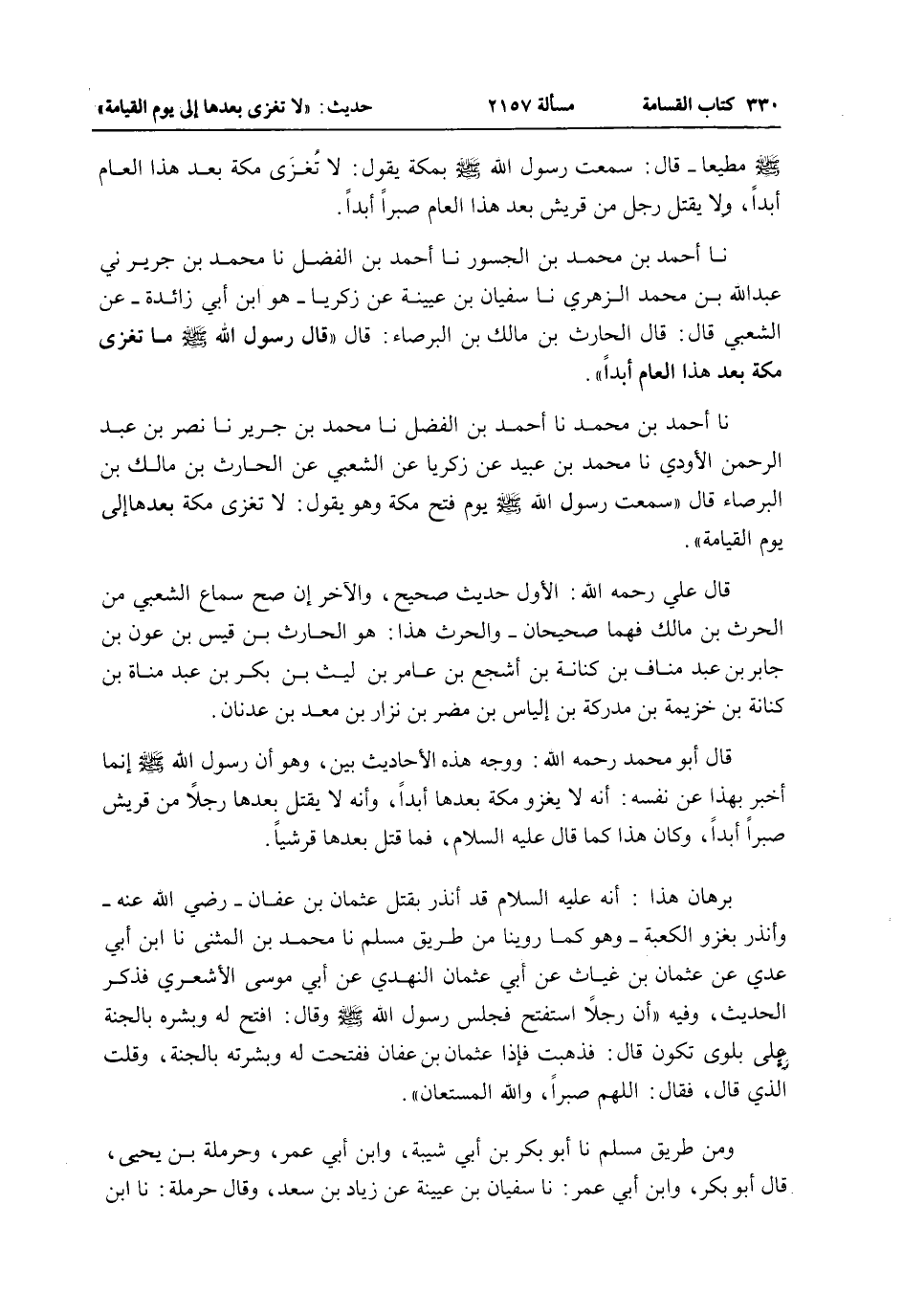 نا أَحْمَدُ بْنُ مُحَمَّدٍ نا أَحْمَدُ بْنُ الْفَضْلِ أَنَا مُحَمَّدُ بْنُ جَرِيرٍ نا نَصْرُ بْنُ عَبْدِ الرَّحْمَنِ الْأَوْدِيُّ نا مُحَمَّدُ بْنُ عُبَيْدٍ عَنْ زَكَرِيَّا عَنْ الشَّعْبِيِّ عَنْ الْحَارِثِ بْنِ مَالِكٍ بْنِ الْبَرْصَاءِ قَالَ «سَمِعْتُ رَسُولَ اللَّهِ - صَلَّى اللَّهُ عَلَيْهِ وَسَلَّمَ - يَوْمَ فَتْحِ مَكَّةَ وَهُوَ يَقُولُ: لَا تُغْزَى مَكَّةُ بَعْدَهَا إلَى يَوْمِ الْقِيَامَةِ» قَالَ عَلِيٌّ - رَحِمَهُ اللَّهُ -: الْأَوَّلِ حَدِيثٌ صَحِيحٌ، وَالْآخَرُ إنْ صَحَّ سَمَاعُ الشَّعْبِيِّ مِنْ الْحَارِثِ بْنِ مَالِكٍ فَهُمَا صَحِيحَانِ - وَالْحَارِثُ هَذَا: هُوَ الْحَارِثُ بْنُ قَيْسِ بْنِ عَوْنِ بْنِ جَابِرِ بْنِ عَبْدِ مَنَافِ بْنِ كِنَانَةَ بْنِ أَشْجَعَ بْنِ عَامِرِ بْنِ لَيْثِ بْنِ بَكْرِ بْنِ عَبْدِ مَنَافِ بْنِ كِنَانَةَ بْنِ خُزَيْمَةَ بْنِ مُدْرِكَةَ بْنِ إلْيَاسَ بْنِ مُضَرَ بْنِ نِزَارِ بْنِ مَعْدِ بْنِ عَدْنَانَ.