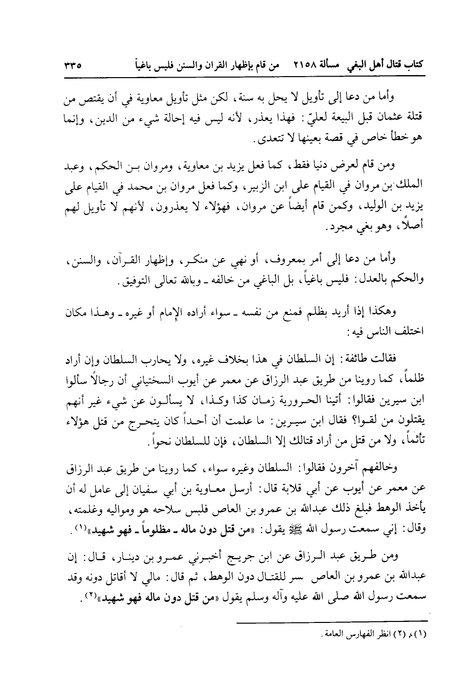وَخَالَفَهُمْ آخَرُونَ فَقَالُوا: السُّلْطَانُ وَغَيْرُهُ سَوَاءٌ، كَمَا رُوِّينَا مِنْ طَرِيقِ عَبْدِ الرَّزَّاقِ عَنْ مَعْمَرٍ عَنْ أَيُّوبَ عَنْ أَبِي قِلَابَةَ قَالَ: «أَرْسَلَ مُعَاوِيَةُ بْنُ أَبِي سُفْيَانَ إلَى عَامِلٍ لَهُ أَنْ يَأْخُذَ الْوَهْطَ فَبَلَغَ ذَلِكَ عَبْدَ اللَّهِ بْنَ عَمْرِو بْنِ الْعَاصِ فَلَبِسَ سِلَاحَهُ هُوَ وَمَوَالِيهِ وَغِلْمَتُهُ، وَقَالَ: إنِّي سَمِعْتُ رَسُولَ اللَّهِ - صَلَّى اللَّهُ عَلَيْهِ وَسَلَّمَ - يَقُولُ: مَنْ قُتِلَ دُونَ مَالِهِ - مَظْلُومًا - فَهُوَ شَهِيدٌ» .