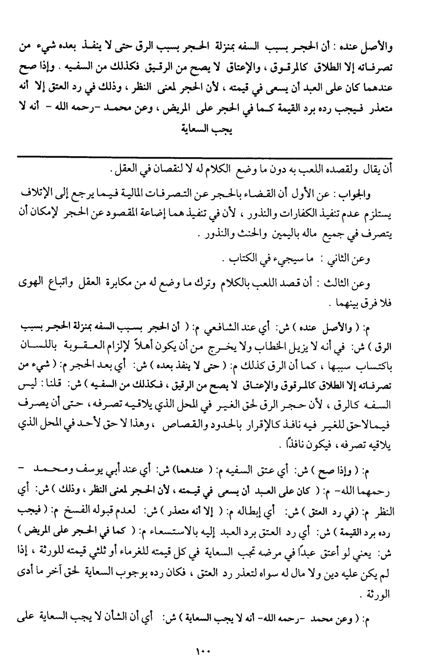 م: (والأصل عنده) ش: أي عند الشافعي م: (أن الحجر بسبب السفه بمنزلة الحجر بسبب الرق) ش: في أنه لا يزيل الخطاب ولا يخرج من أن يكون أهلا لإلزام العقوبة باللسان باكتساب سببها، كما أن الرق كذلك م: (حتى لا ينفذ بعده) ش: أي بعد الحجر م: (شيء من تصرفاته إلا الطلاق كالمرقوق والإعتاق لا يصح من الرقيق، فكذلك من السفيه) ش: قلنا: ليس السفه كالرق؛ لأن حجر الرق لحق الغير في المحل الذي يلاقيه تصرفه، حتى إن يصرف فيما لا حق للغير فيه نافذ كالإقرار بالحدود والقصاص، وهذا لا حق لأحد في المحل الذي يلاقيه تصرفه، فيكون نافذا.