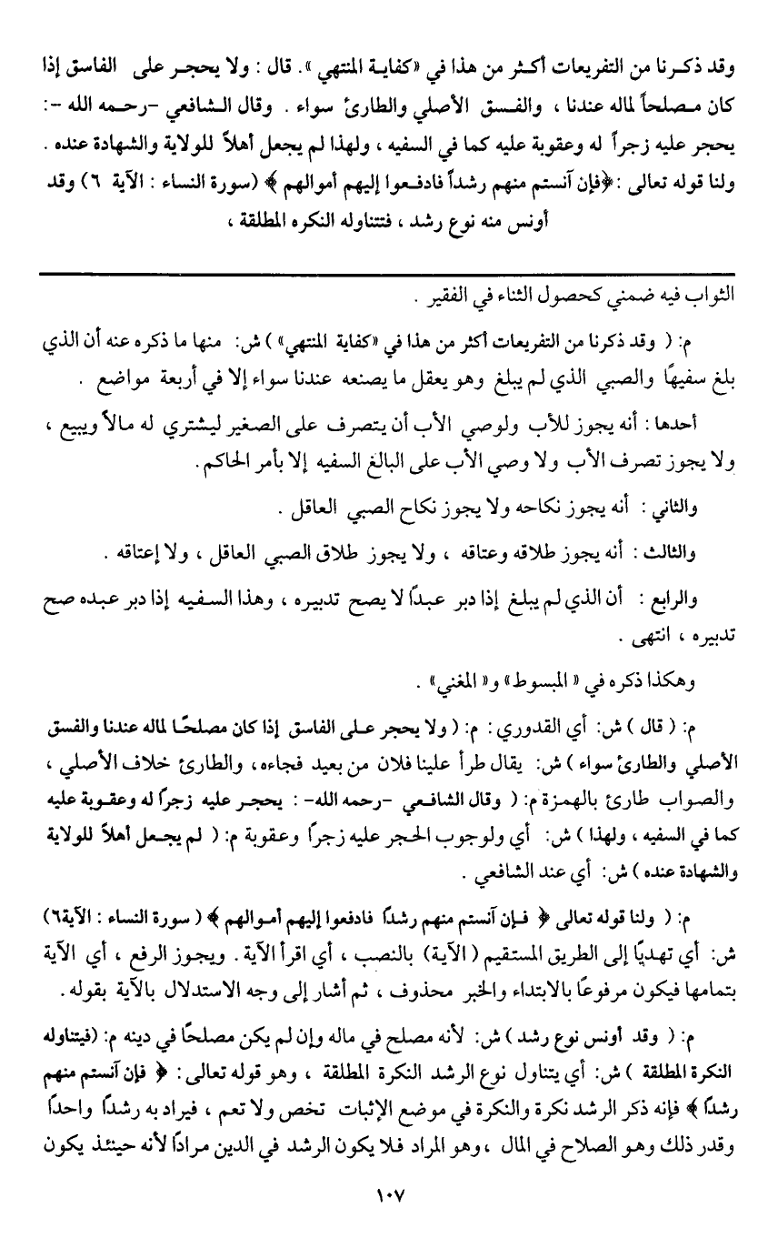 م: (ولنا قَوْله تَعَالَى: {فَإِنْ آنَسْتُمْ مِنْهُمْ رُشْدًا فَادْفَعُوا إِلَيْهِمْ أَمْوَالَهُمْ} [النساء: 6] (سورة النساء: الآية 6) ش: أي تهديا إلى الطريق المستقيم (الآية) بالنصب، أي اقرأ الآية. ويجوز الرفع، أي الآية بتمامها فيكون مرفوعا بالابتداء والخبر محذوف، ثم أشار إلى وجه الاستدلال بالآية بقوله.