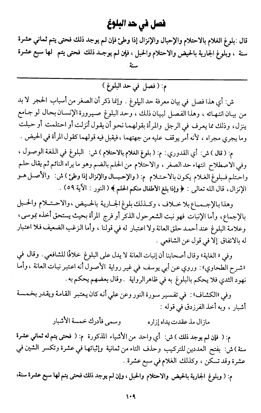 م: (وبلوغ الجارية بالحيض والاحتلام والحبل، وإن لم يوجد ذلك فحتى يتم لها سبع عشرة سنة،