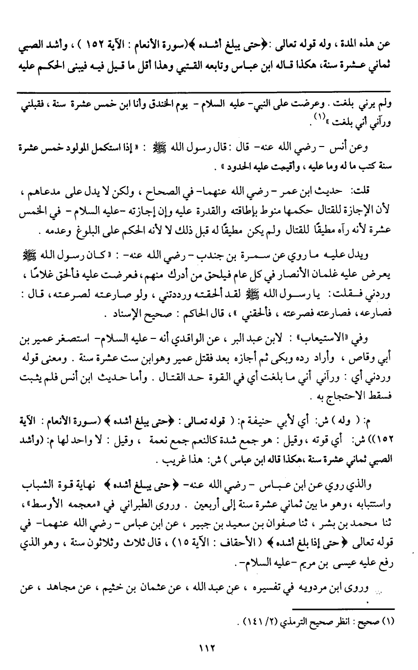 والذي روي عن ابن عباس - رَضِيَ اللَّهُ عَنْهُ - {حَتَّى يَبْلُغَ أَشُدَّهُ} [الأنعام: 152] نهاية قوة الشباب واستتبابه، وهو ما بين ثماني عشرة سنة إلى أربعين. وروى الطبراني في "معجمه الأوسط "، ثنا محمد بن بشر، ثنا صفوان بن سعيد بن جبير، عن ابن عباس - رَضِيَ اللَّهُ عَنْهُمَا - في قَوْله تَعَالَى {حَتَّى يَبْلُغَ أَشُدَّهُ} [الأنعام: 152] (الأحقاف: الآية 15) ، قال ثلاث وثلاثون سنة، وهو الذي رفع عليه عيسى ابن مريم - عَلَيْهِ السَّلَامُ -.