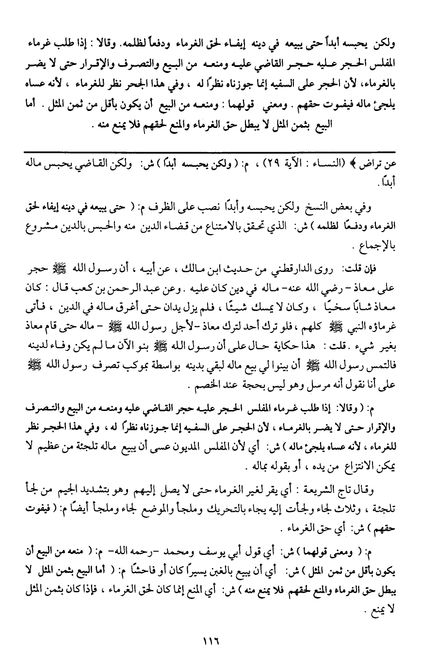 ـــــــــــــــــــــــــــــQعَنْ تَرَاضٍ} [النساء: 29] (النساء: الآية 29) ، م: (ولكن يحبسه أبدا) ش: ولكن القاضي يحبس ماله أبدا.