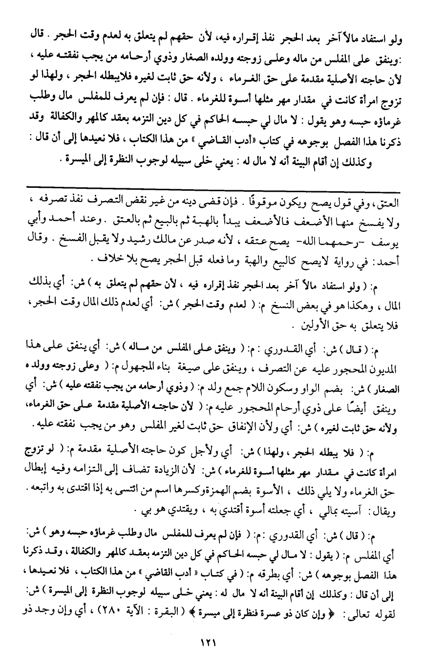 ولو استفاد مالا آخر بعد الحجر نفذ إقراره فيه، لأن حقهم لم يتعلق به لعدم وقت الحجر. قال: وينفق على المفلس من ماله وعلى زوجته وولده الصغار وذوي أرحامه من يجب نفقته عليه؛ لأن حاجته الأصلية مقدمة على حق الغرماء، ولأنه حق ثابت لغيره فلا يبطله الحجر، ولهذا لو تزوج امرأة كانت في مقدار مهر مثلها أسوة للغرماء. قال: فإن لم يعرف للمفلس مال وطلب غرماؤه حبسه وهو يقول: لا مال لي حبسه الحاكم في كل دين التزمه بعقد كالمهر والكفالة وقد ذكرنا هذا الفصل بوجوهه في كتاب "أدب القاضي" من هذا الكتاب، فلا نعيدها، إلى أن قال: وكذلك إن أقام البينة أنه لا مال له: يعني خلى سبيله لوجوب النظرة إلى الميسرة.