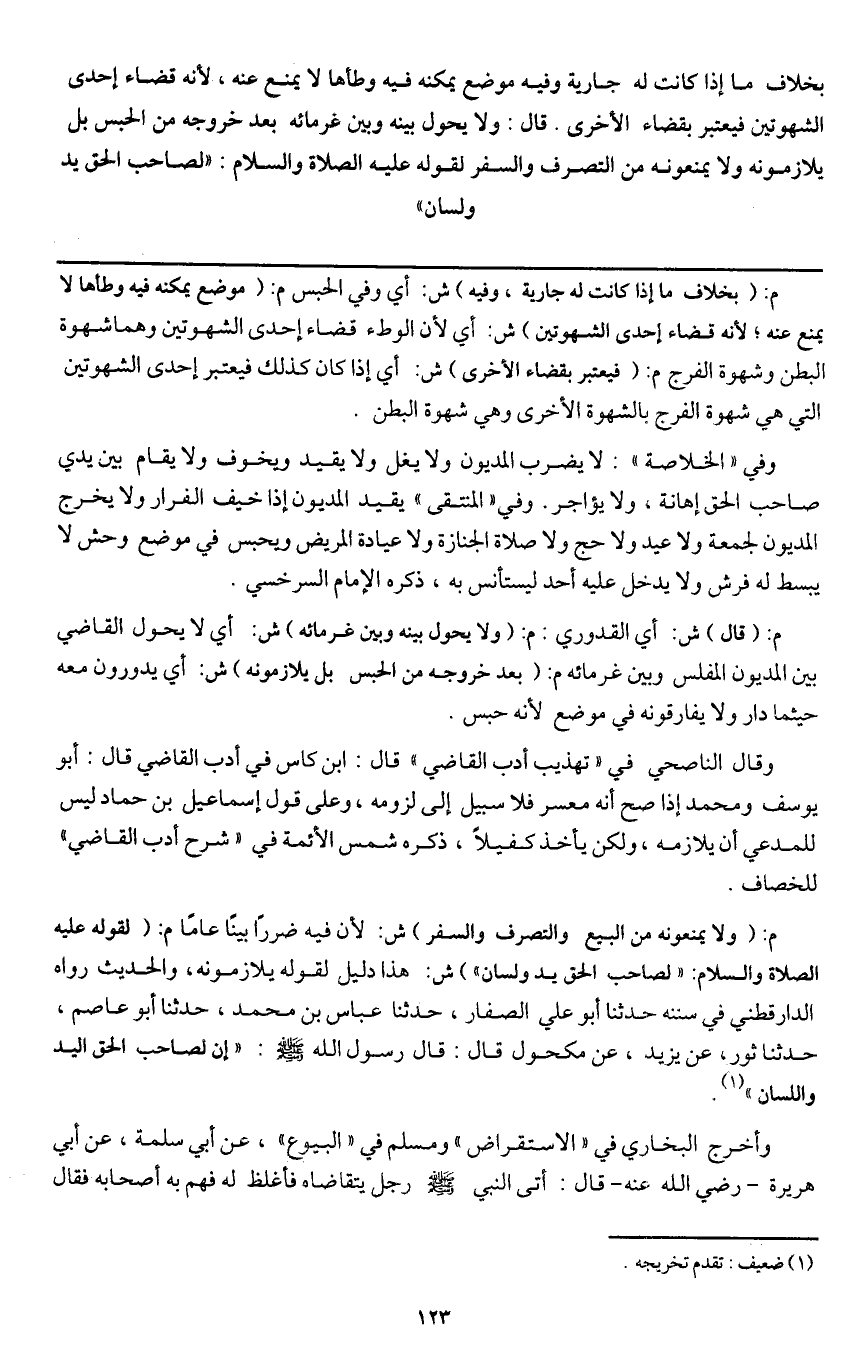 م: (ولا يمنعونه من البيع والتصرف والسفر) ش: لأن فيه ضررا بينا عاما م: (لقوله - عَلَيْهِ الصَّلَاةُ وَالسَّلَامُ -: «لصاحب الحق يد ولسان» ش: هذا دليل لقوله يلازمون، والحديث رواه الدارقطني في سننه حدثنا أبو علي الصفار، حدثنا عباس بن محمد، حدثنا أبو عاصم، حدثنا ثور، عن يزيد، عن مكحول قال: قال رسول الله - صَلَّى اللَّهُ عَلَيْهِ وَسَلَّمَ -: «إن لصاحب الحق اليد واللسان» .
