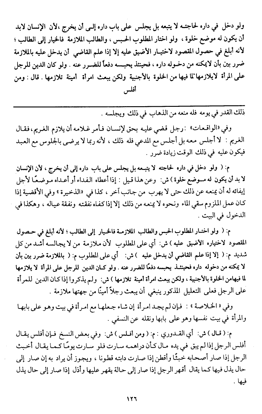 م: (ولو دخل في داره لحاجته لا يتبعه بل يجلس على باب داره إلى أن يخرج، لأن الإنسان لا بد أن يكون له موضع خلوة) ش: وعن هذا قيل: إذا أعطاه الفداء أو أعداه موضعا لأجل إيفائه له أن يمنعه عن ذلك حتى لا يهرب من جانب آخر، كذا في " الذخيرة " وفي الأقضية إذا كان عمل الملزوم سقي الماء ونحوه لا يمنعه من ذلك إلا إذا كفاه نفقته ونفقة عياله، وهكذا في الدخول في البيت.