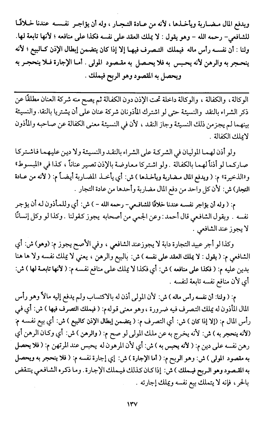 ـــــــــــــــــــــــــــــQالوكالة، والكفالة، والوكالة داخلة تحت الإذن دون الكفالة ثم يصح منه شركة العنان مطلقا عن ذكر الشراء بالنقد والنسيئة حتى لو اشترك المأذونان شركة عنان على أن يشتريا بالنقد والنسيئة لم يجز من ذلك النسيئة وجاز النقد؛ لأن في النسيئة معنى الكفالة عن صاحبه والمأذون لا يملك الكفالة.