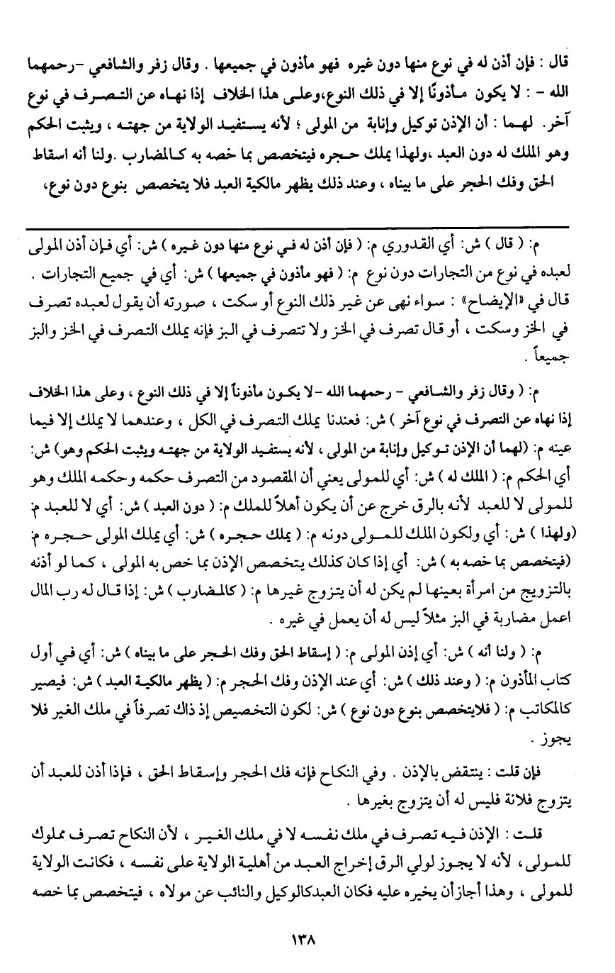 م: (ولنا أنه) ش: أي إذن المولى م: (إسقاط الحق وفك الحجر على ما بيناه) ش: أي في أول كتاب المأذون م: (وعند ذلك) ش: أي عند الإذن وفك الحجر م: (يظهر مالكية العبد) ش: فيصير كالمكاتب م: (فلا يتخصص بنوع دون نوع) ش: لكون التخصيص إذ ذاك تصرفا في ملك الغير فلا يجوز.