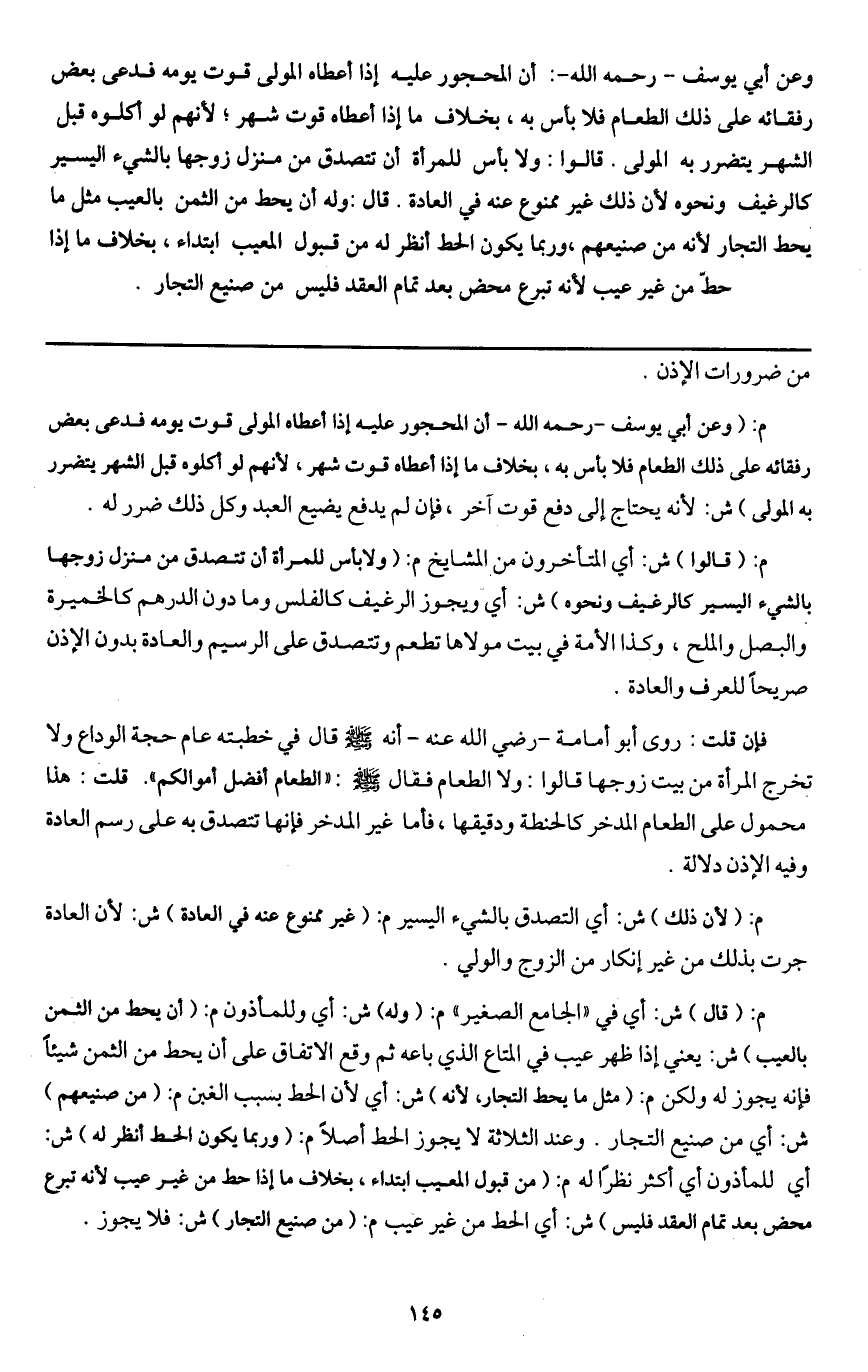 وعن أبي يوسف - رَحِمَهُ اللَّهُ -: أن المحجور عليه إذا أعطاه المولى قوت يومه فدعا بعض رفقائه على ذلك الطعام فلا بأس به، بخلاف ما إذا أعطاه قوت شهر؛ لأنهم لو أكلوه قبل الشهر يتضرر به المولى. قالوا: ولا بأس للمرأة أن تتصدق من منزل زوجها بالشيء اليسير كالرغيف ونحوه؛ لأن ذلك غير ممنوع عنه في العادة.