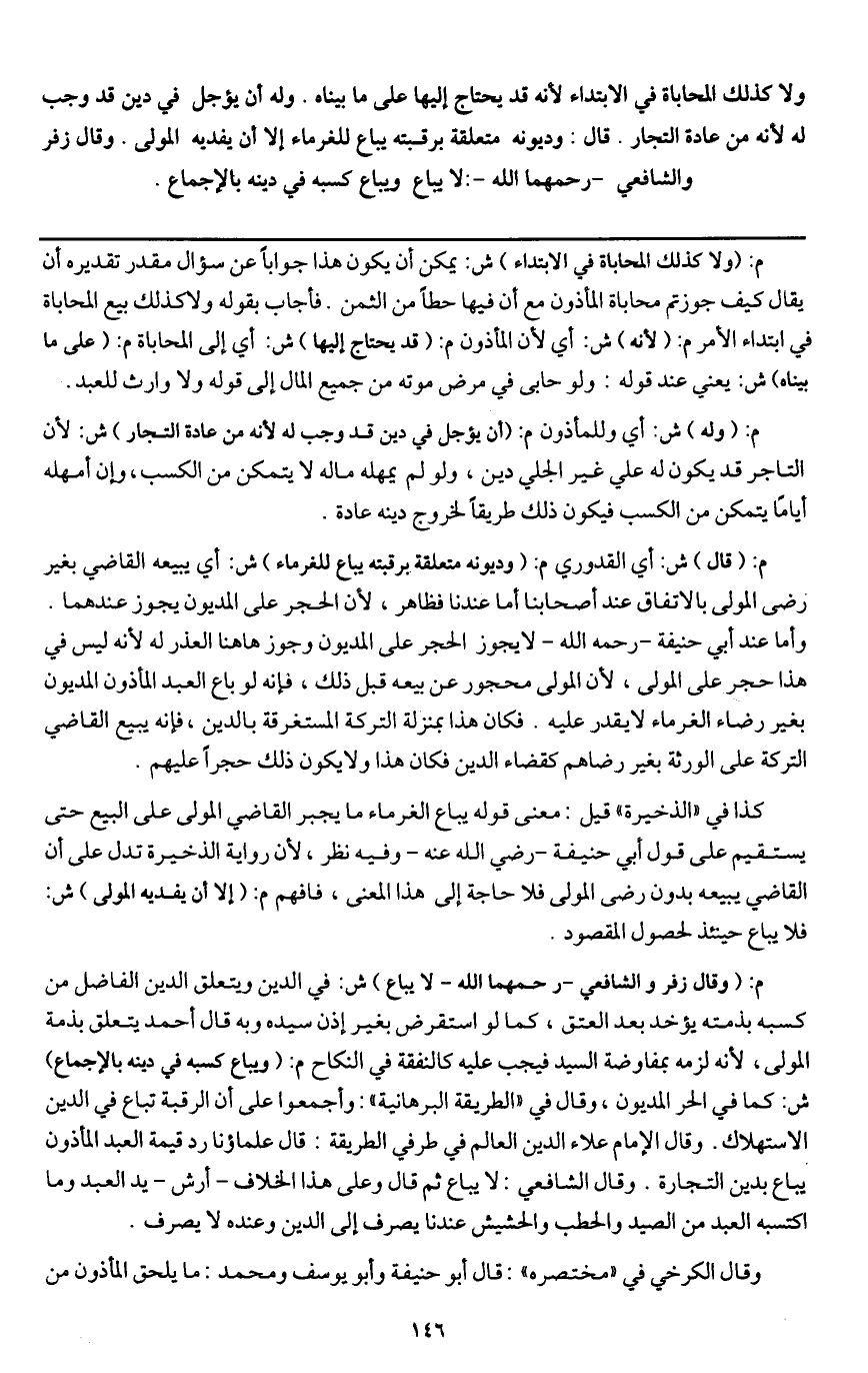 ولا كذلك المحاباة في الابتداء لأنه قد يحتاج إليها على ما بيناه. وله أن يؤجل في دين قد وجب له لأنه من عادة التجار. قال: وديونه متعلقة برقبته يباع للغرماء إلا أن يفديه المولى. وقال زفر والشافعي - رحمهما الله -: لا يباع ويباع كسبه في دينه بالإجماع.