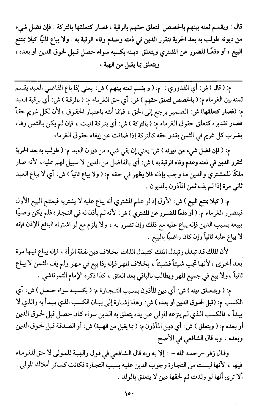 قال: ويقسم ثمنه بينهم بالحصص لتعلق حقهم بالرقبة فصار كتعلقها بالتركة. فإن فضل شيء من ديونه طولب به بعد الحرية لتقرر الدين في ذمته وعدم وفاء الرقبة به. ولا يباع ثانيا كيلا يمتنع البيع، أو دفعا للضرر عن المشتري ويتعلق دينه بكسبه سواء حصل قبل لحوق الدين أو بعده ويتعلق بما يقبل من الهبة،