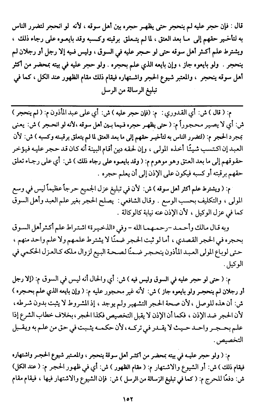 قال: فإن حجر عليه لم ينحجر حتى يظهر حجره فيما بين أهل سوقه؛ لأنه لو انحجر لتضرر الناس به لتأخير حقهم إلى ما بعد العتق لما لم يتعلق برقبته وكسبه وقد بايعوه على رجاء ذلك، ويشترط علم أكثر أهل سوقه حتى لو حجر عليه في السوق، وليس فيه إلا رجل أو رجلان لم ينحجر. ولو بايعوه جاز، وإن بايعه الذي علم بحجره ولو حجر عليه في بيته بمحضر من أكثر أهل سوقه ينحجر، والمعتبر شيوع الحجر واشتهاره فيقام ذلك مقام الظهور عند الكل كما في تبليغ الرسالة من الرسل،