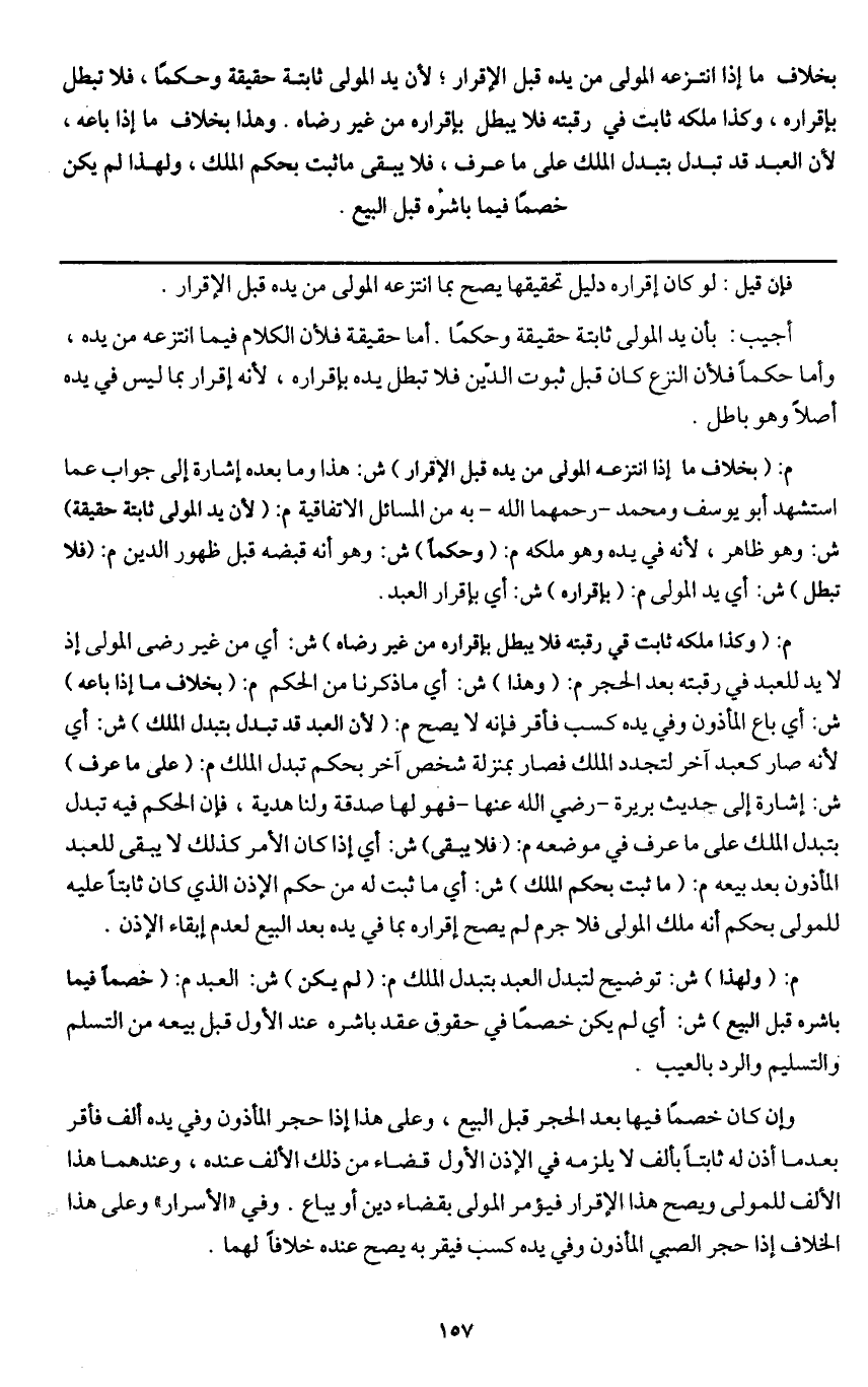 أجيب: بأن يد المولى ثابتة حقيقة وحكما. أما حقيقة فلأن الكلام فيما انتزعه من يده، وأما حكما فلأن النزع كان قبل ثبوت الدين فلا تبطل يده بإقراره؛ لأنه إقرار بما ليس في يده أصلا وهو باطل.