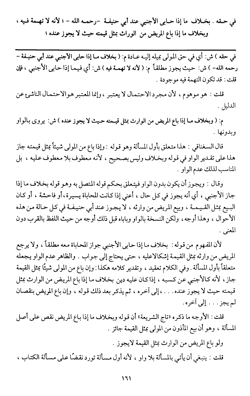 وقال: ويجوز أن يكون بدون الواو فيتعلق بحكم قوله المتصل به وهو قوله بخلاف ما إذا جاز الأجنبي، أي أنه يجوز في كل حال، أعني إذا كانت المحاباة يسيرة، أو فاحشة، أو كان البيع بمثل القيمة، وبيع المريض من وارثه، لا يجوز عند أبي حنيفة في كل حالة من هذه الأحوال، وهذا أوجه، ولكن النسخة بالواو وباباه قبل ذلك أوجه من حيث اللفظ بالقرب دون المعنى.