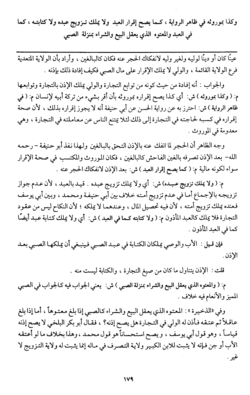 وكذا بموروثه في ظاهر الرواية، كما يصح إقرار العبد ولا يملك تزويج عبده ولا كتابته، كما في العبد والمعتوه الذي يعقل البيع والشراء بمنزلة الصبي