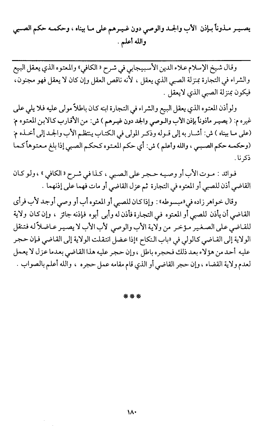 ـــــــــــــــــــــــــــــQوقال شيخ الإسلام علاء الدين الأسبيجابي في شرح " الكافي " والمعتوه الذي يعقل البيع والشراء في التجارة بمنزلة الصبي الذي يعقل؛ لأنه ناقص العقل وإن كان لا يعقل فهو مجنون، فيكون بمنزلة الصبي الذي لا يعقل.