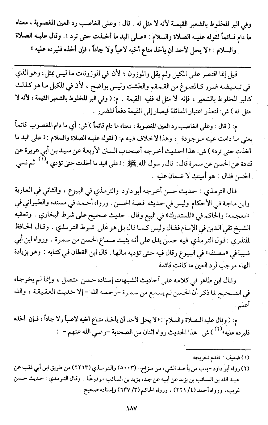 قال الترمذي: حديث حسن أخرجه أبو داود والترمذي في البيوع، والثاني في العارية وابن ماجه في الأحكام وليس في حديثه قصة الحسن. ورواه أحمد في مسنده والطبراني في " معجمه " والحاكم في " المستدرك " في البيع وقال: حديث صحيح على شرط البخاري. وتعقبه الشيخ تقي الدين في الإمام فقال: وليس كما قال بل هو على شرط الترمذي. وقال الحافظ المنذري: وقول الترمذي فيه حسن يدل على أنه يثبت سماع الحسن من سمرة. ورواه ابن أبي شيبة في " مصنفه " في البيوع وقال فيه حتى تؤديه مالها. قال ابن القطان في كتابه: وهو بزيادة الهاء موجب لرد العين ما كانت قائمة.