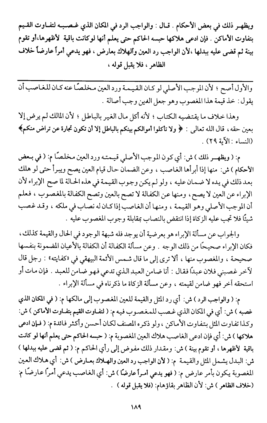 والجواب عن مسألة الإبراء هو بعرضية أن يوجد فله شبهة الوجود في الحال والقيمة كذلك، فكان الإبراء صحيحا من ذلك الوجه. وعن مسألة الكفالة أن الكفالة بالأعيان المضمونة بنفسها صحيحة، والمغصوب منها، ألا ترى إلى ما قال شمس الأئمة البيهقي في " كفايته ": رجل قال لآخر غصبني فلان عبدا فقال: أنا ضامن العبد الذي تدعي فهو ضامن للعبد. فإن مات أو استحقه آخر فهو ضامن لقيمته، وعن مسألة الزكاة ما ذكرناه في مسألة الإبراء.