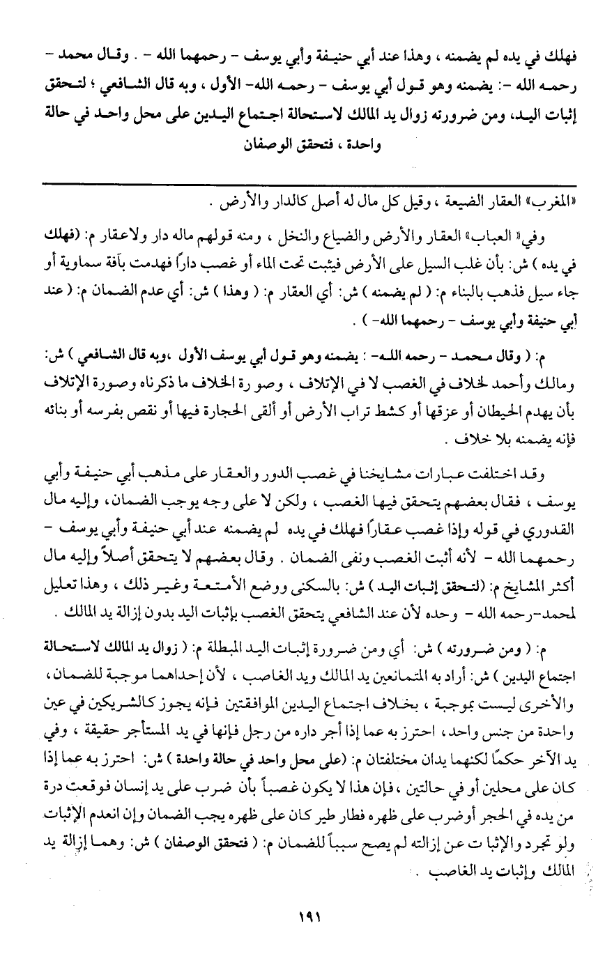 وقد اختلفت عبارات مشايخنا في غصب الدور والعقار على مذهب أبي حنيفة وأبي يوسف، فقال بعضهم يتحقق فيها الغصب، ولكن لا على وجه يوجب الضمان، وإليه مال القدوري في قوله وإذا غصب عقارا فهلك في يده لم يضمنه عند أبي حنفية وأبي يوسف رحمهما الله؛ لأنه أثبت الغصب ونفى الضمان. وقال بعضهم لا يتحقق أصلا وإليه مال أكثر المشايخ م: (لتحقق إثبات اليد) ش: بالسكنى ووضع الأمتعة وغير ذلك، وهذا تعليل لمحمد - رَحِمَهُ اللَّهُ - وحده؛ لأن عند الشافعي يتحقق الغصب بإثبات اليد بدون إزالة يد المالك.