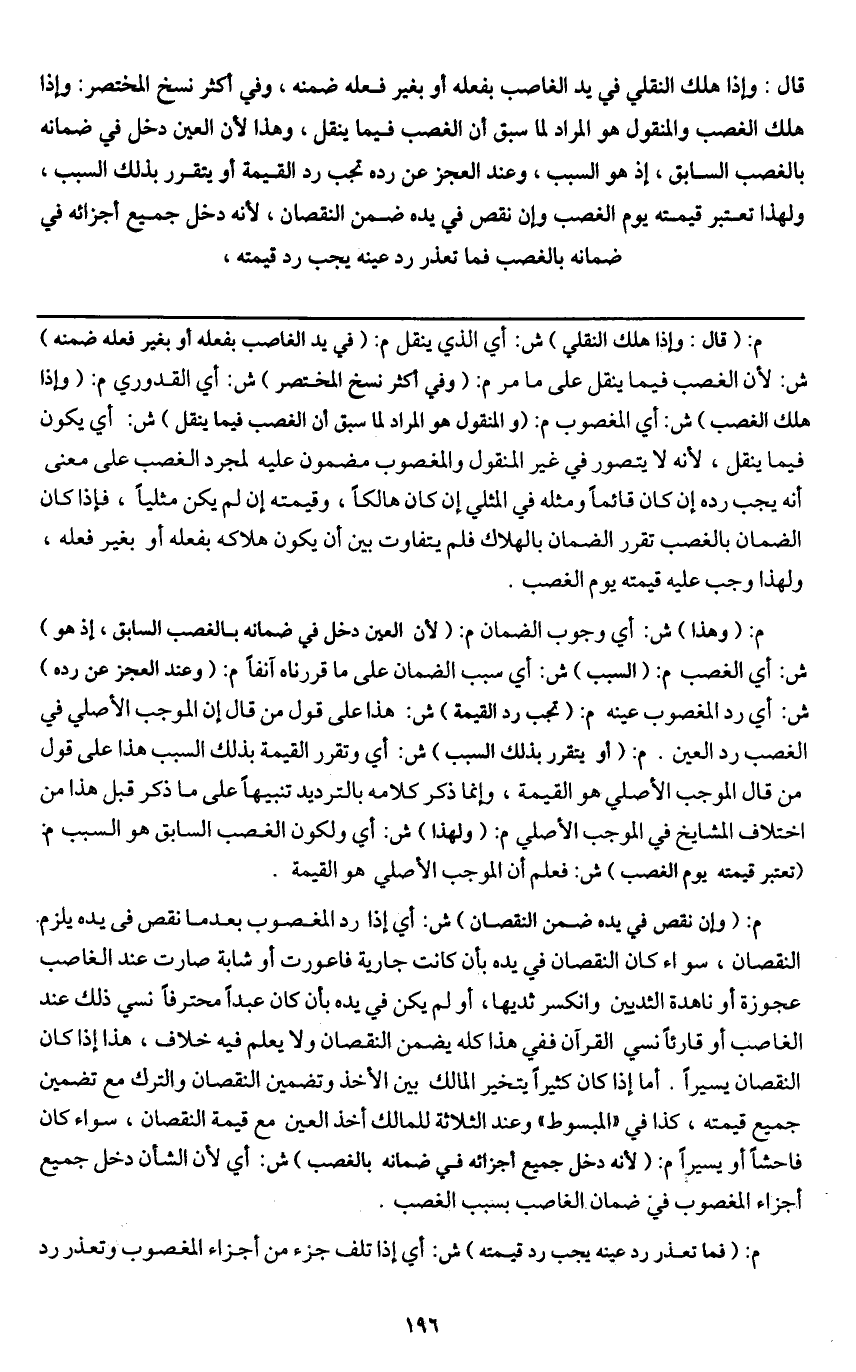 ـــــــــــــــــــــــــــــQم: (قال: وإذا هلك النقلي) ش: أي الذي ينقل م: (في يد الغاصب بفعله أو بغير فعله ضمنه) ش: لأن الغصب فيما ينقل على ما مر م: (وفي أكثر نسخ المختصر) ش: أي القدوري م: (وإذا هلك الغصب) ش: أي المغصوب م: (والمنقول هو المراد لما سبق أن الغصب فيما ينقل) ش: أي يكون فيما ينقل؛ لأنه لا يتصور في غير المنقول، والمغصوب مضمون عليه لمجرد الغصب على معنى أنه يجب رده إن كان قائما، ومثله في المثلي إن كان هالكا، وقيمته إن لم يكن مثليا، فإذا كان الضمان بالغصب تقرر الضمان بالهلاك فلم يتفاوت بين أن يكون هلاكه بفعله أو بغير فعله، ولهذا وجب عليه قيمته يوم الغصب.